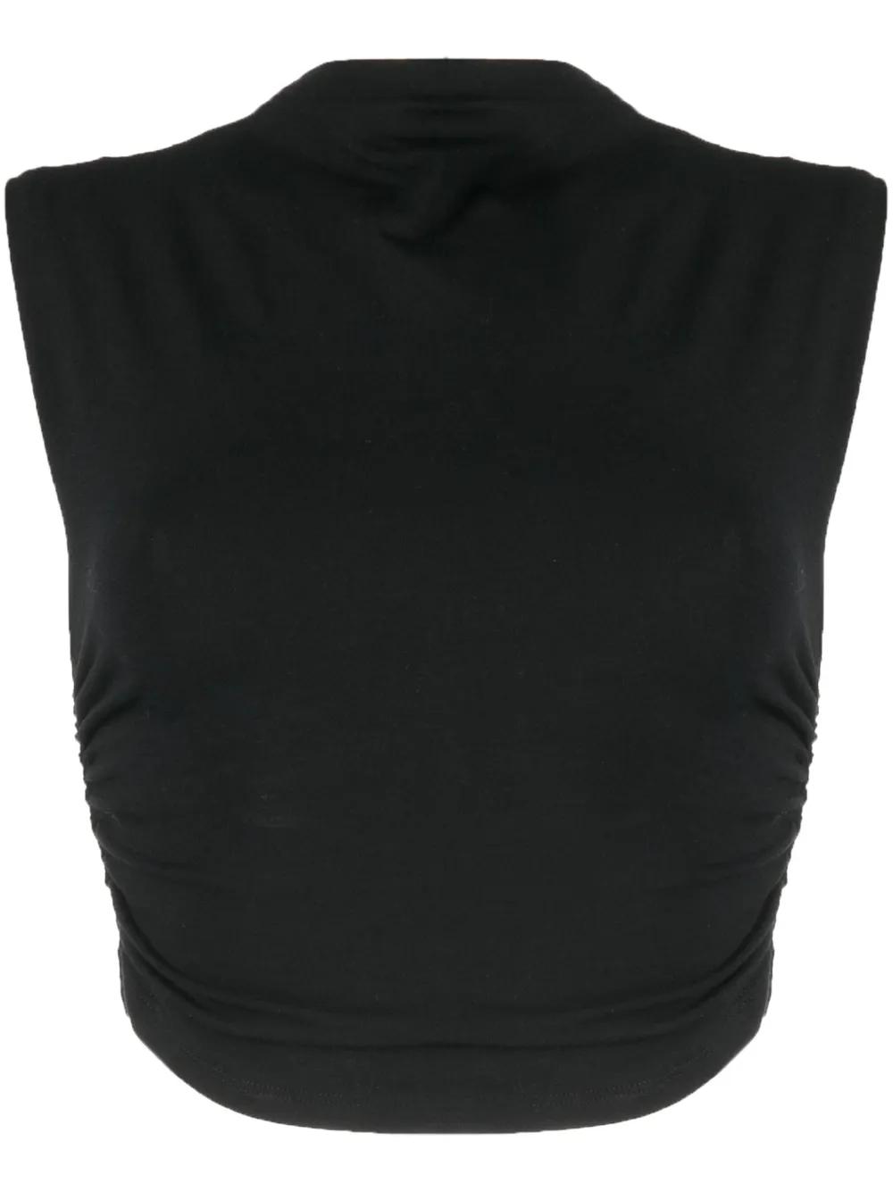 jet black stretch-cotton sleeveless gathered detailing mock neck asymmetric hem
