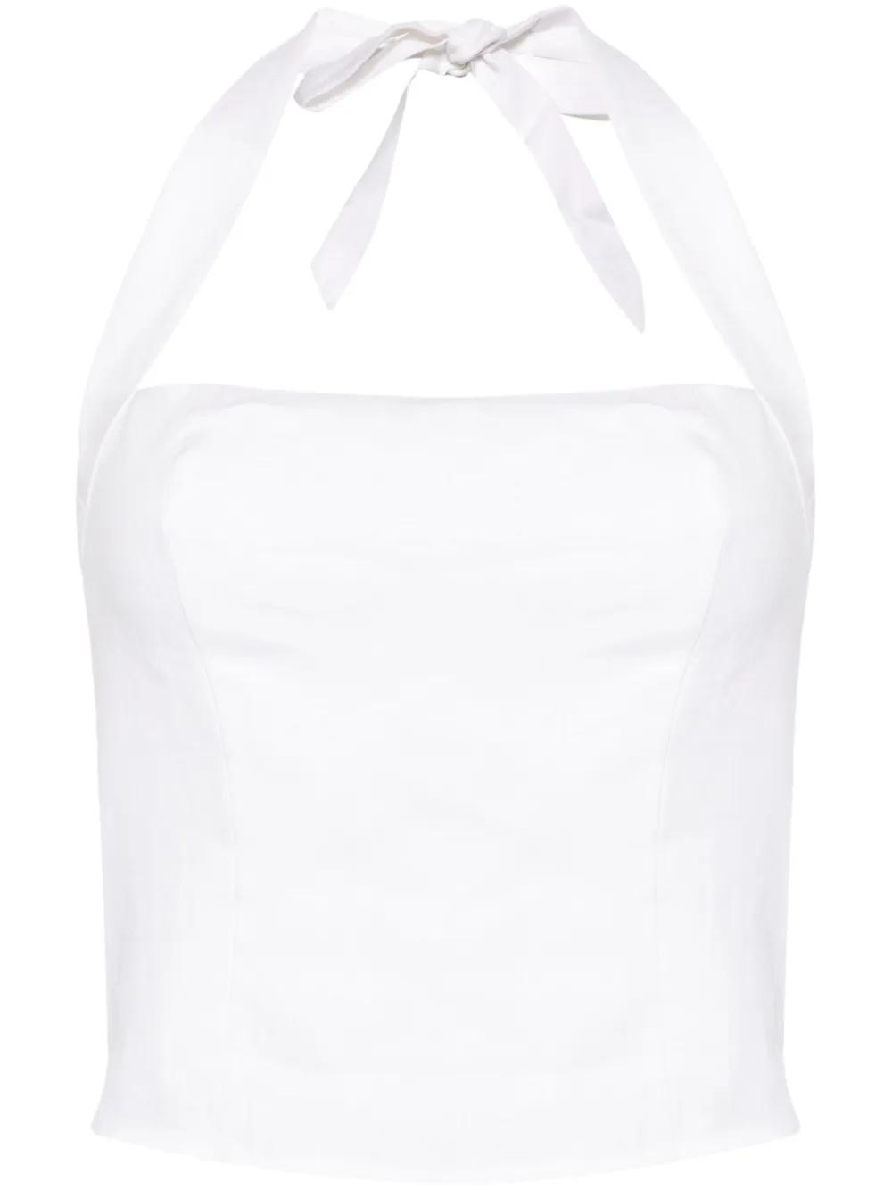 white linen/flax halterneck tie fastening square neck smocked panel straight hem cropped