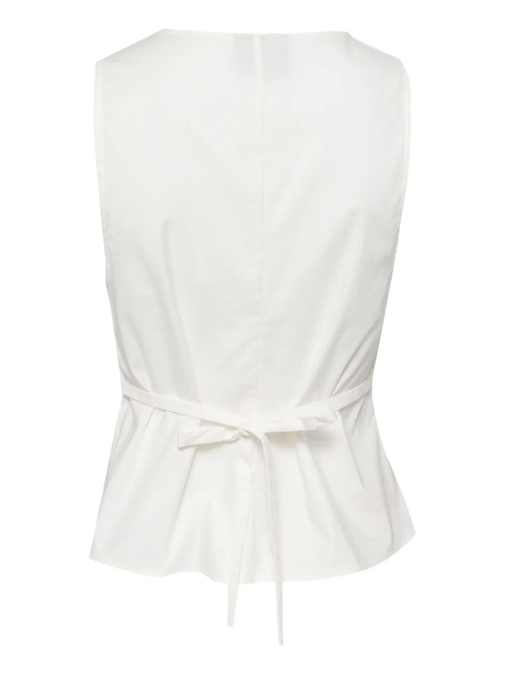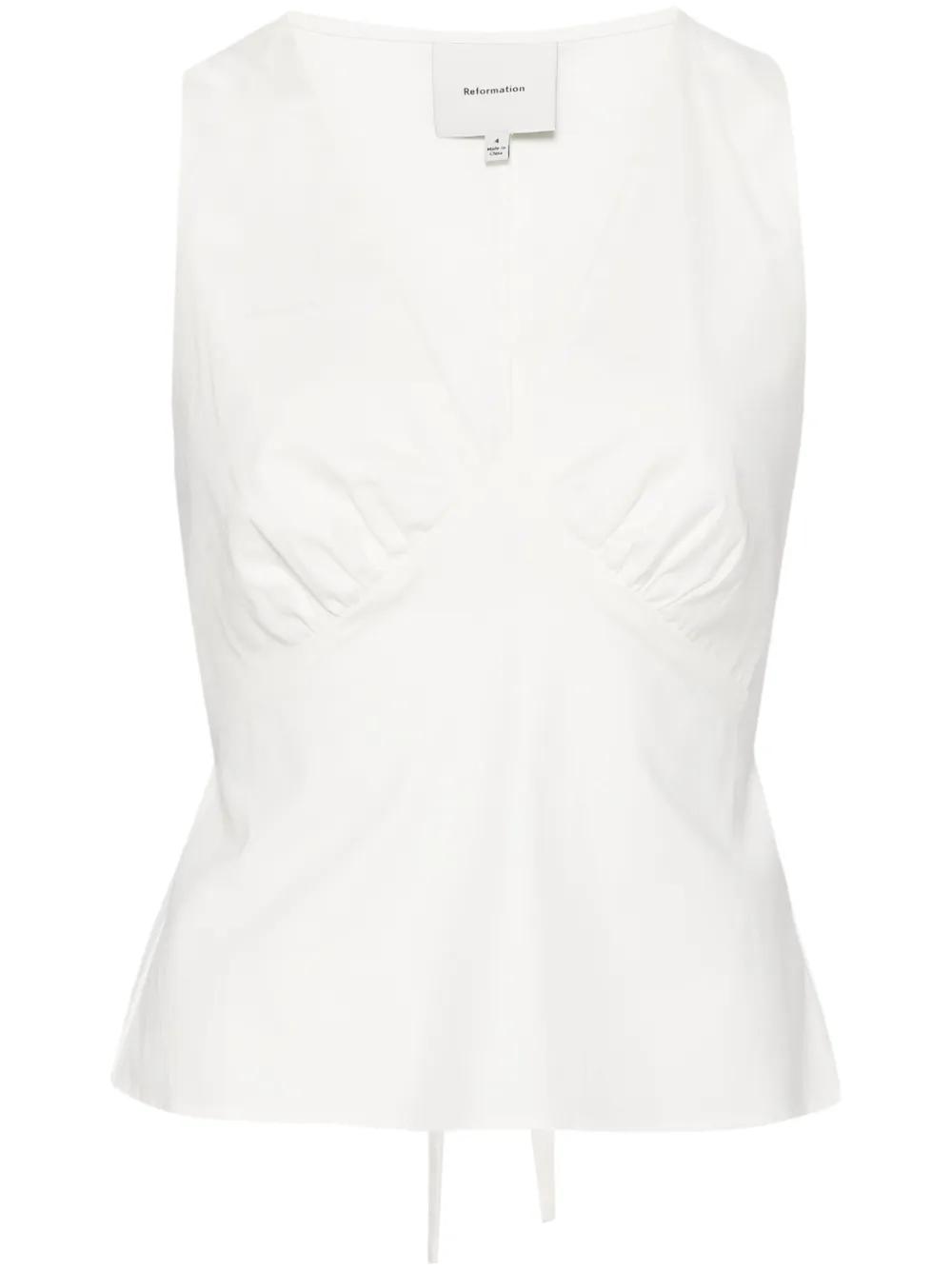 white organic cotton blend stretch-design plunging V-neck sleeveless ruched bodice adjustable waist strap