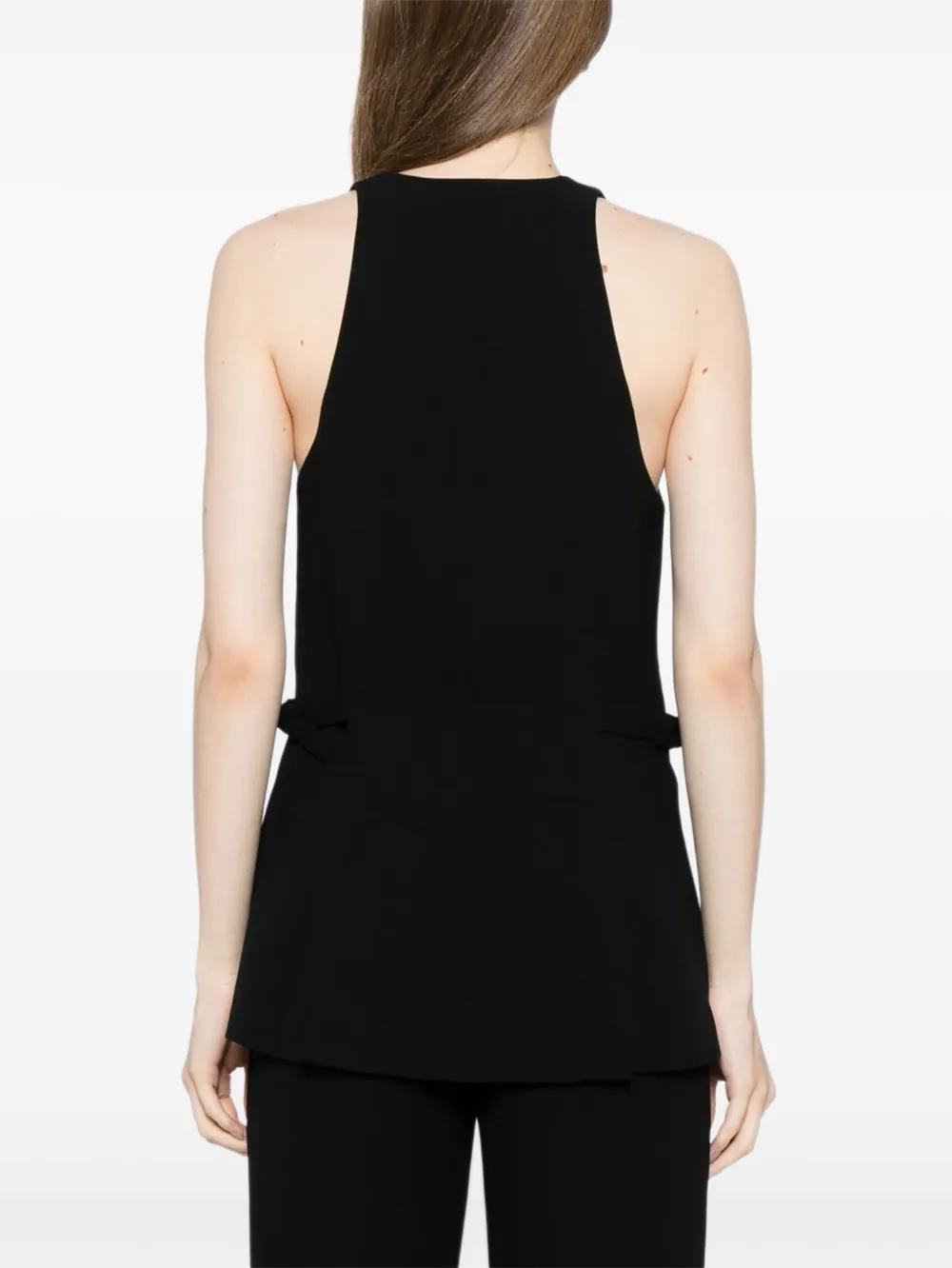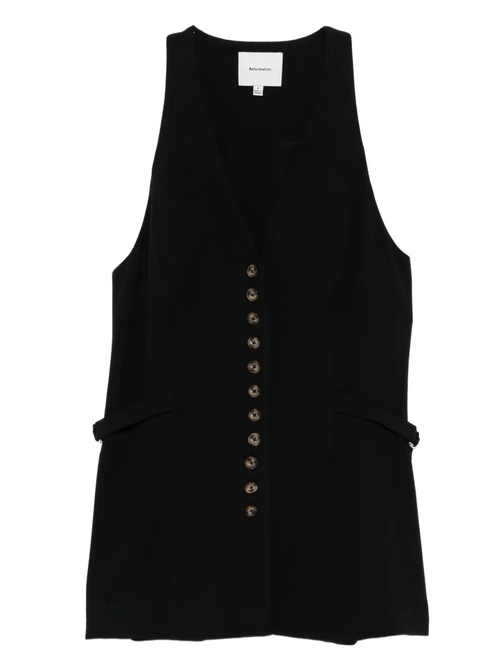 black front button fastening two adjustable shoulder straps two button-fastening chest pockets asymmetric hem