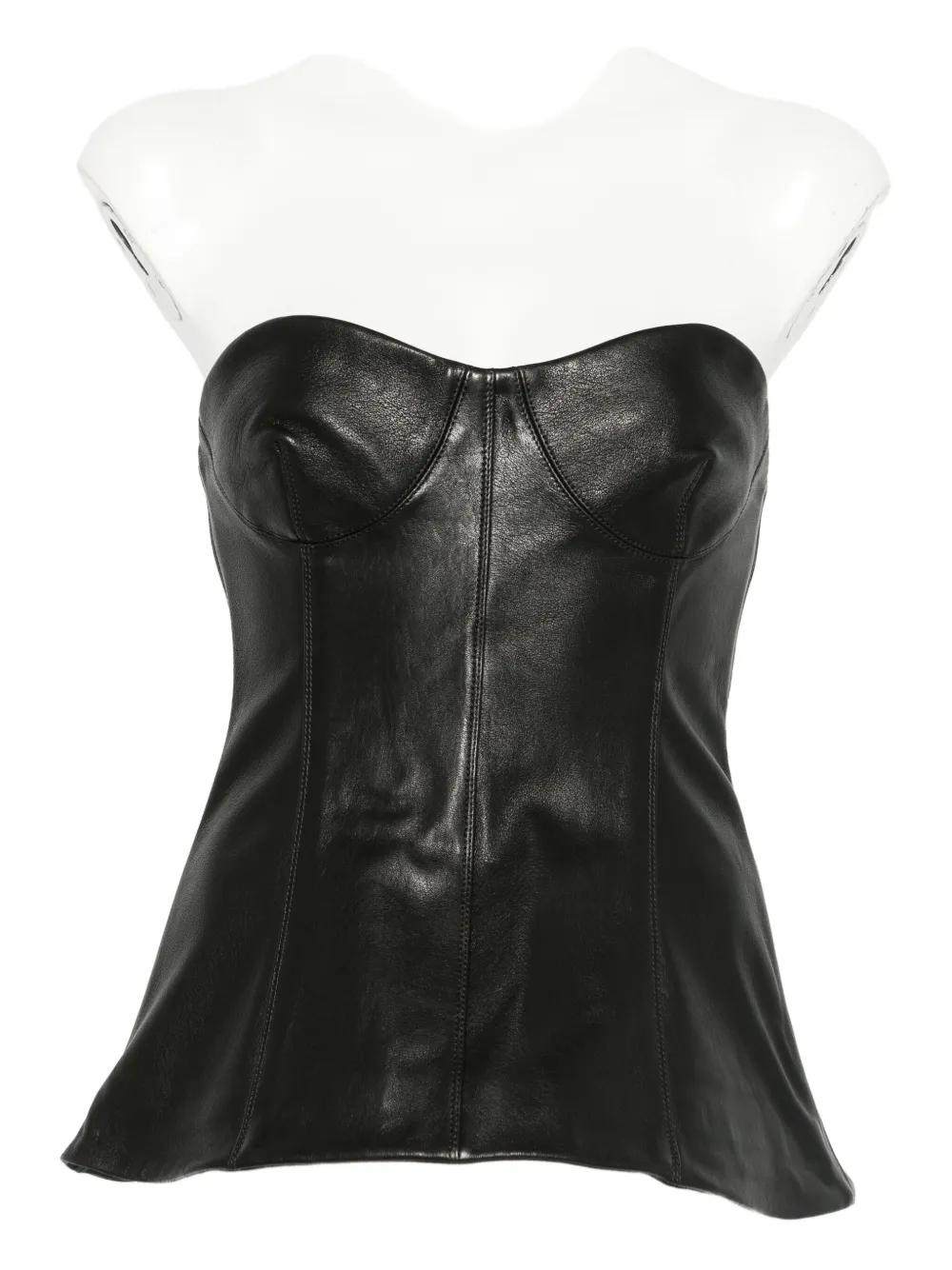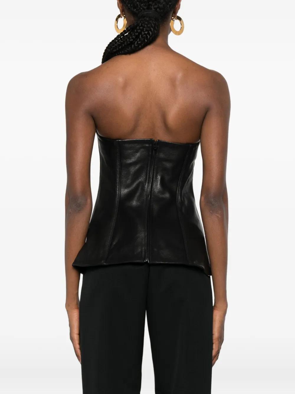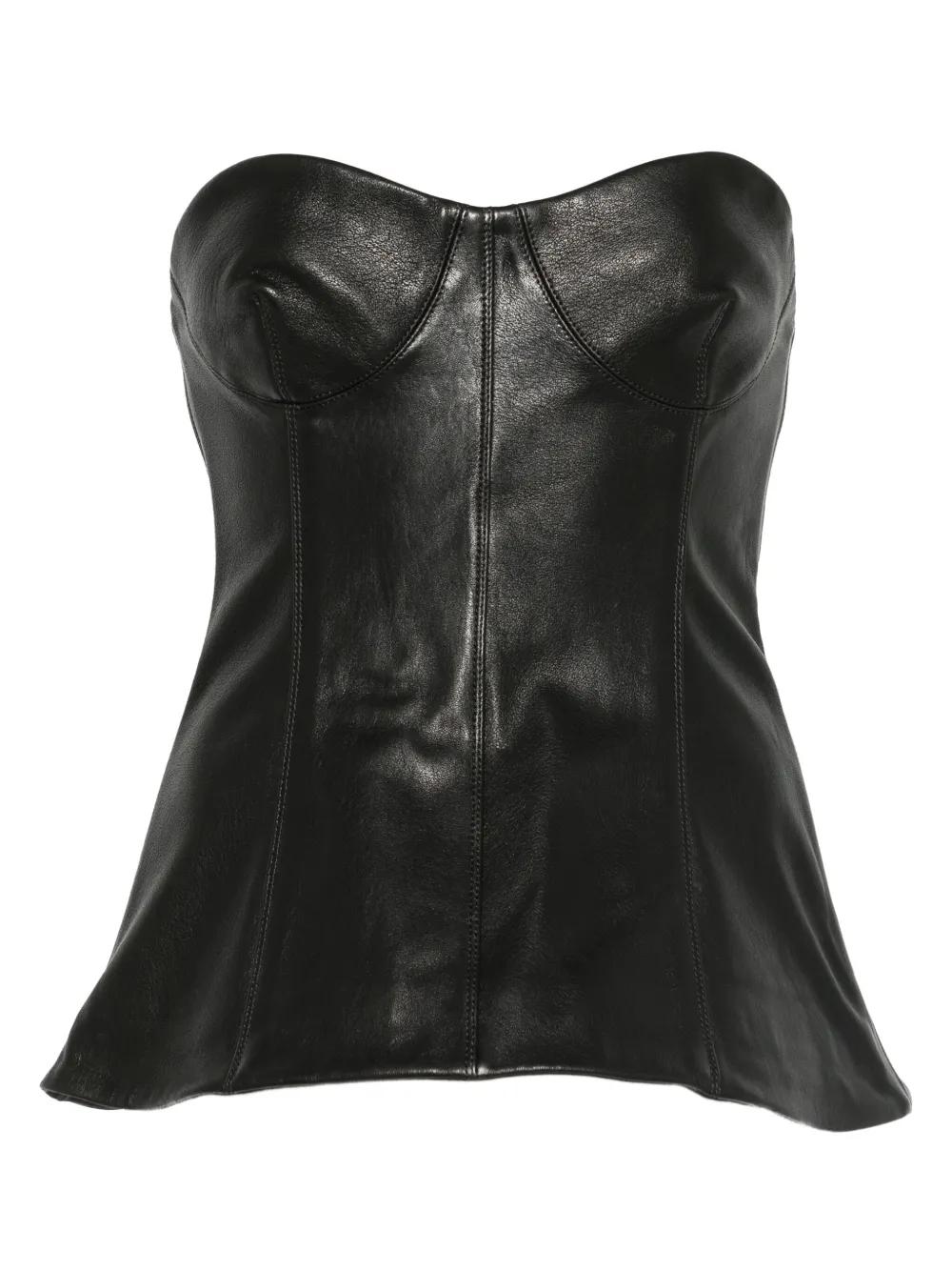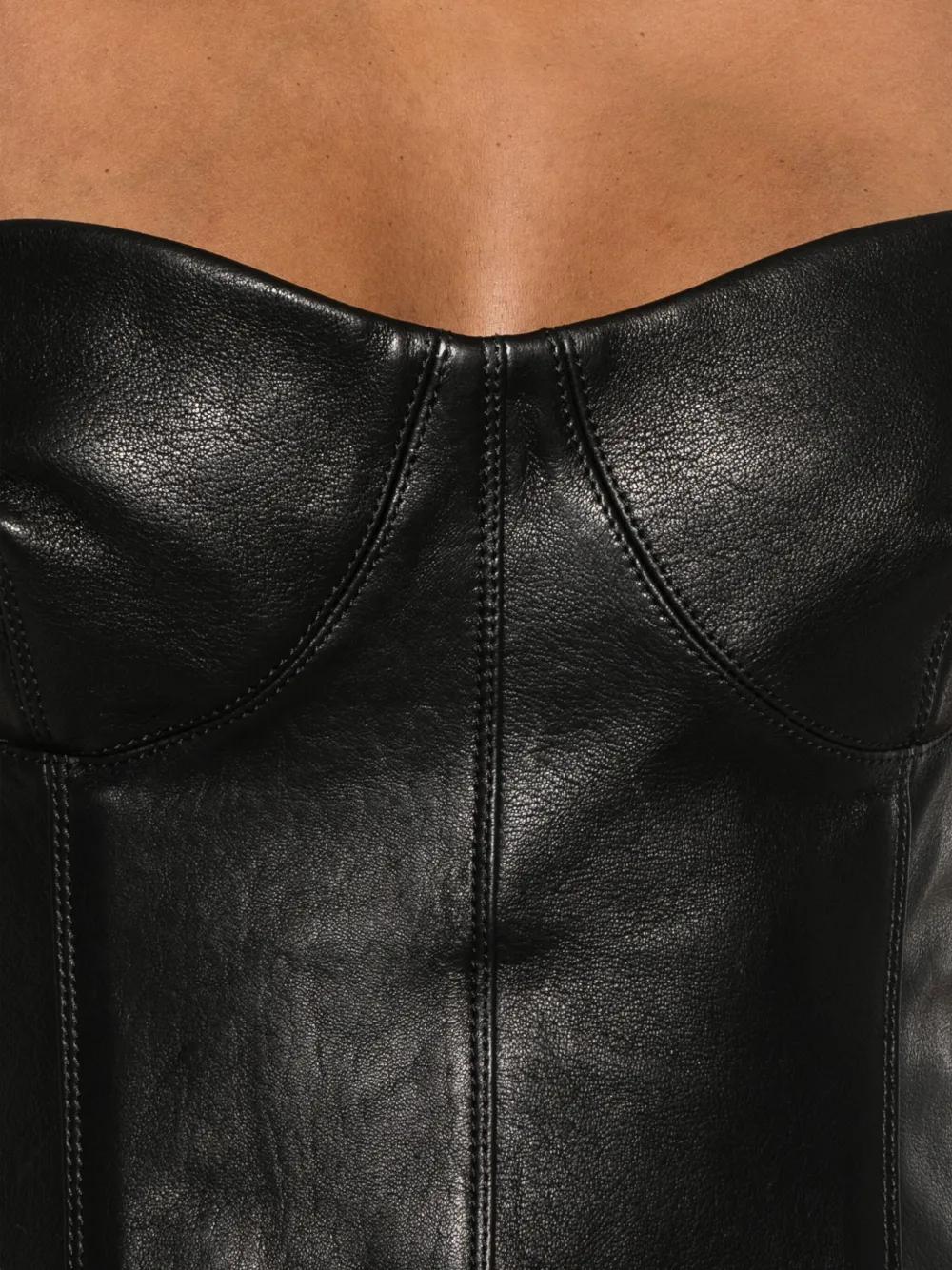 black leather strapless bustier design flared hem seam detailing