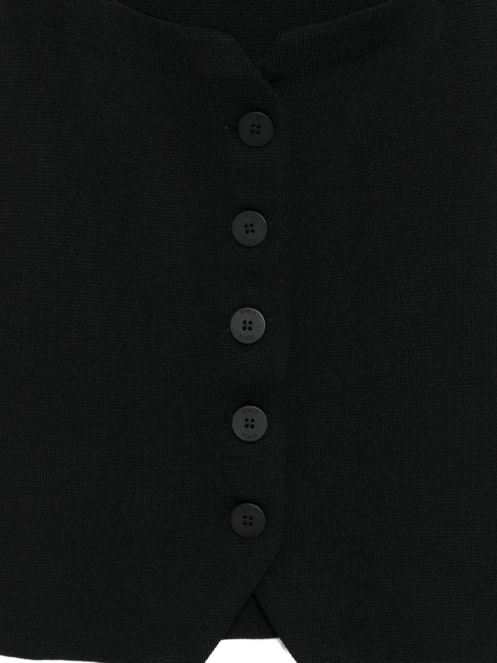 black cotton round neck sleeveless logo print to the front decorative button detailing straight hem