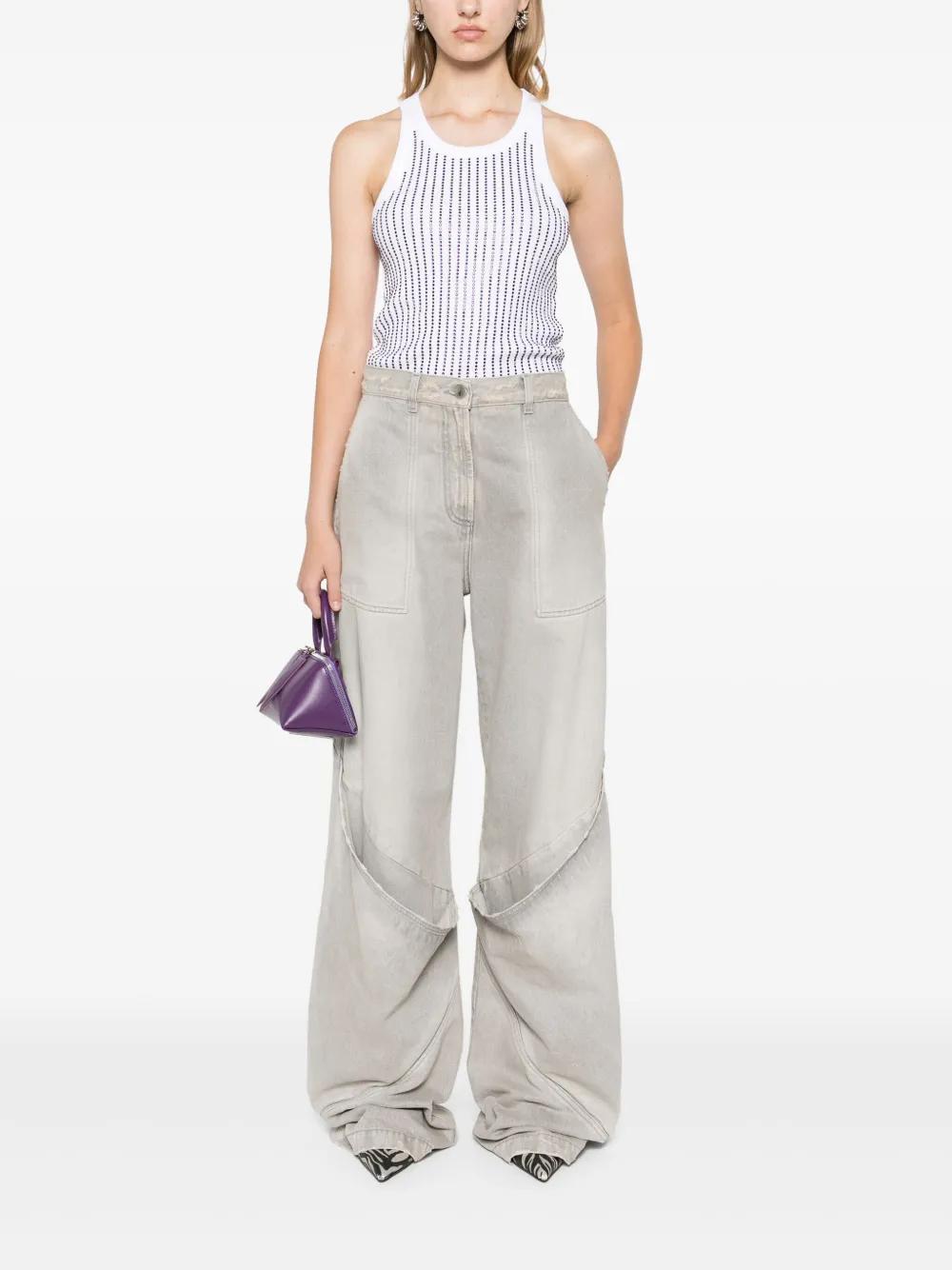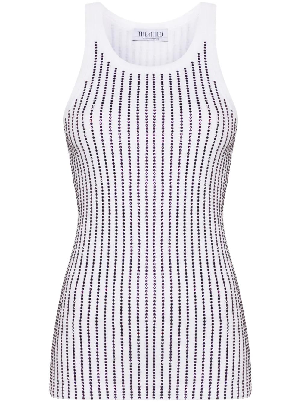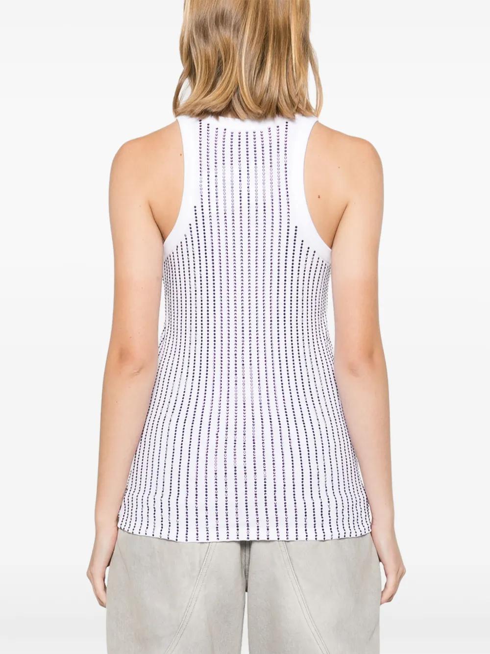 white cotton fine ribbed crystal embellishment round neck sleeveless racerback straight hem