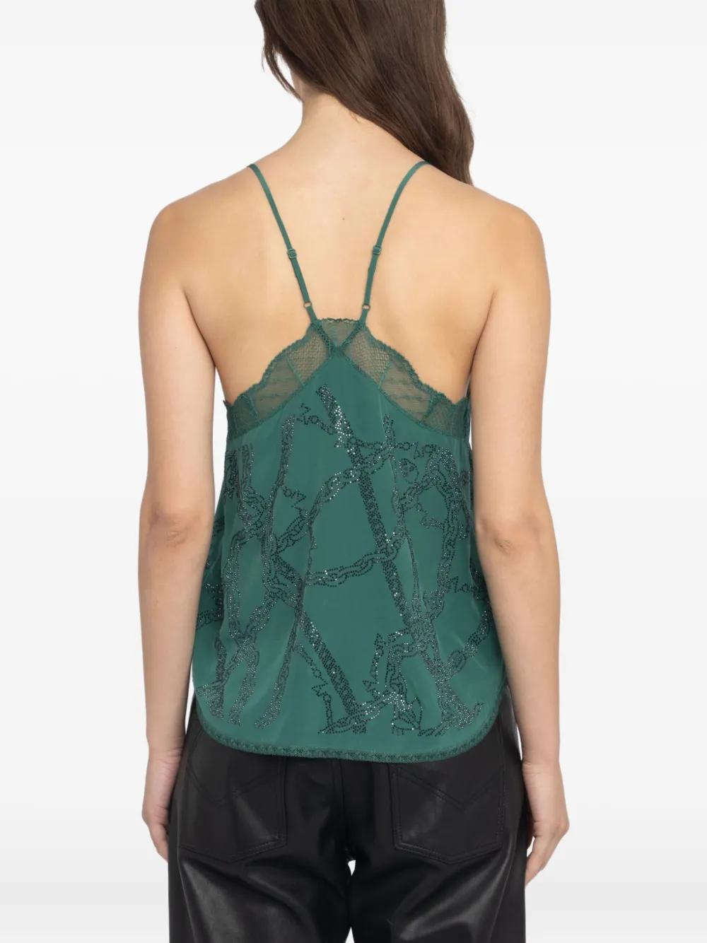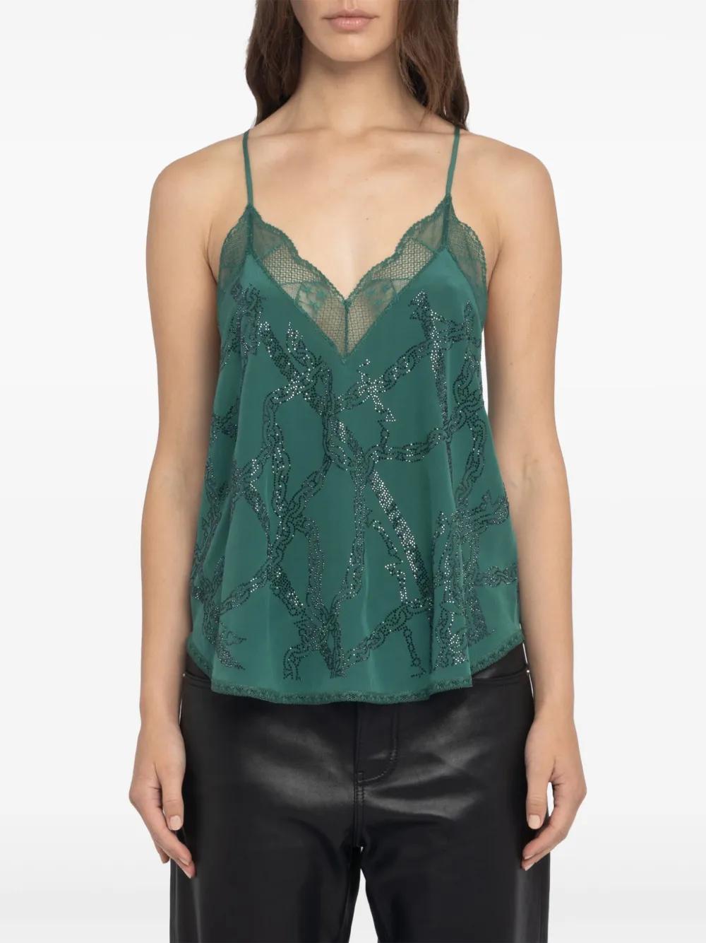 green lace trim detailing spaghetti straps delicate chain design flowing silhouette