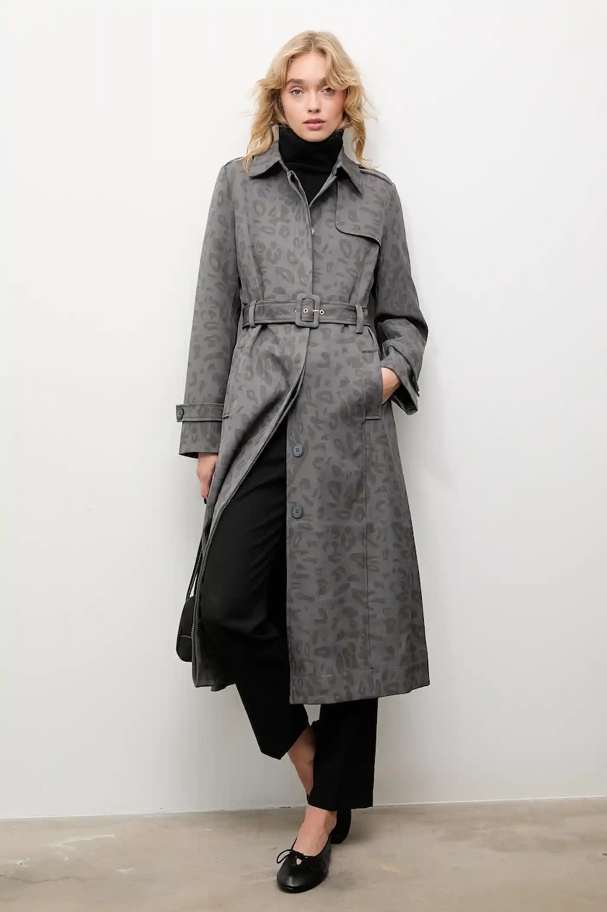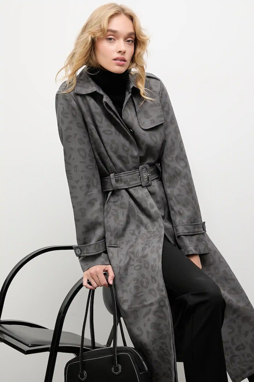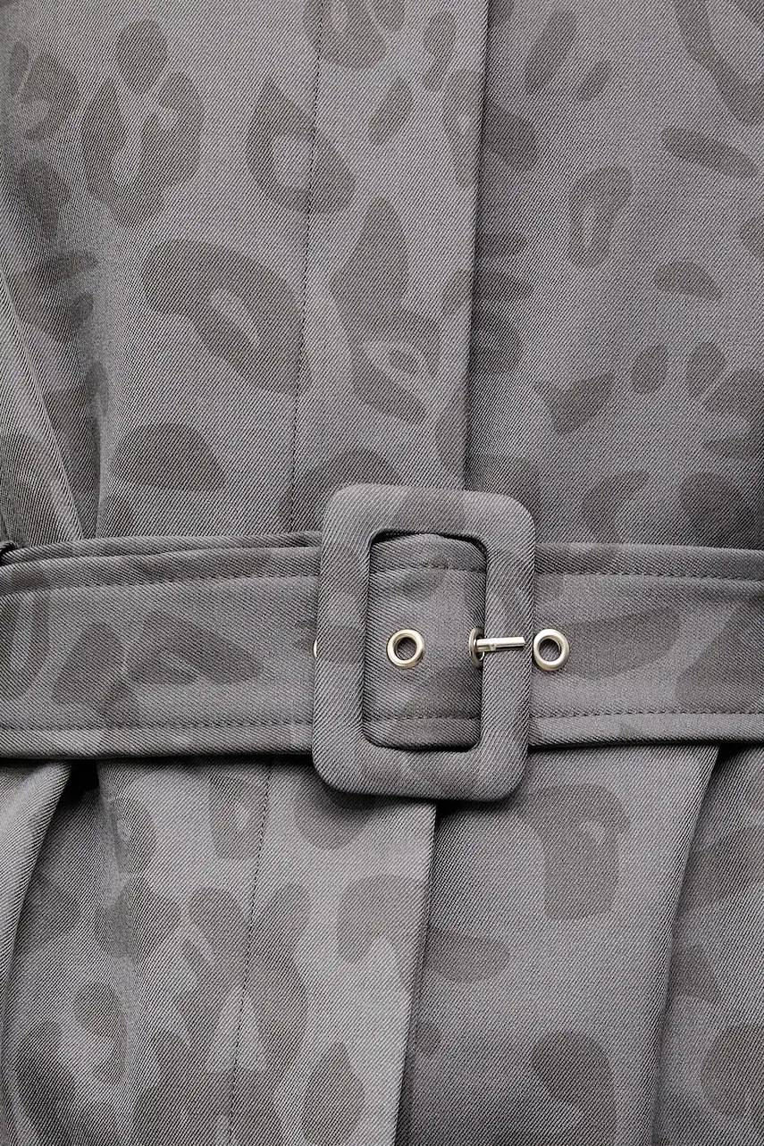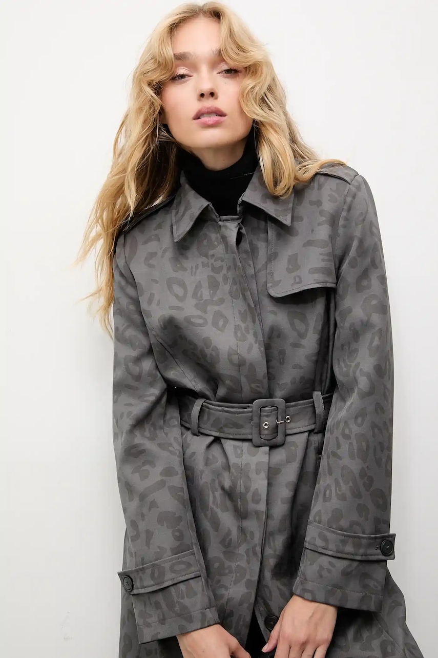 - Prosty, nie blokujący ruchów fason. - Nieocieplony model na podszewce. - Model z kołnierzykiem. - Na ramionach pagony. - W talii pasek, który modeluje sylwetkę i dodatkowo podkreśla talię. - Zapięcie na guziki. - Wsuwane kieszenie. - Cienki materiał. - Długość rękawa: 62 cm. - Długość: 118 cm. - Szerokość pod pachami: 45 cm. - Szerokość w ramionach: 38 cm. - Wymiary podane dla rozmiaru: S.