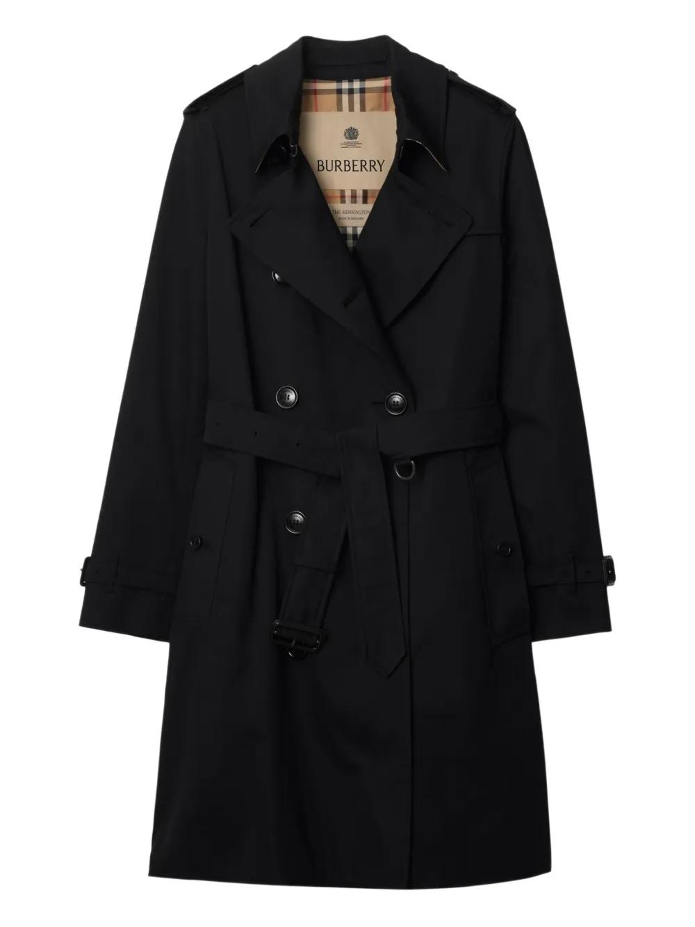 black double-breasted button closure hook-and-eye collar closure throat latch epaulettes belt side button welt pockets belted cuffs back button vent