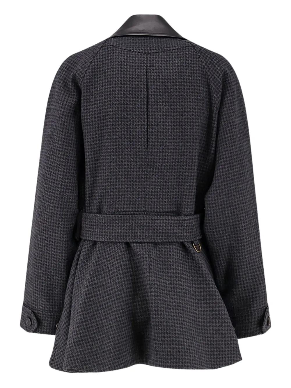 black houndstooth pattern leather collar flap pockets belt covered buckle