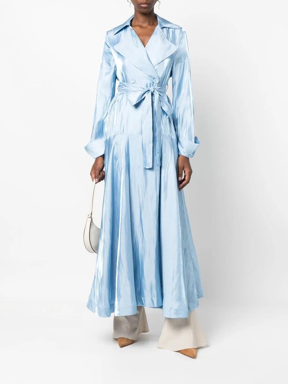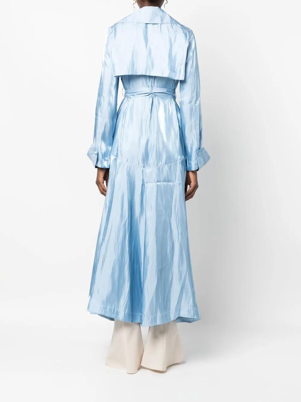 ice blue metallic sheen double-breasted button fastening belted waist peplum hem notched lapels overlapping panel buttoned cuffs long sleeves curved hem long length
