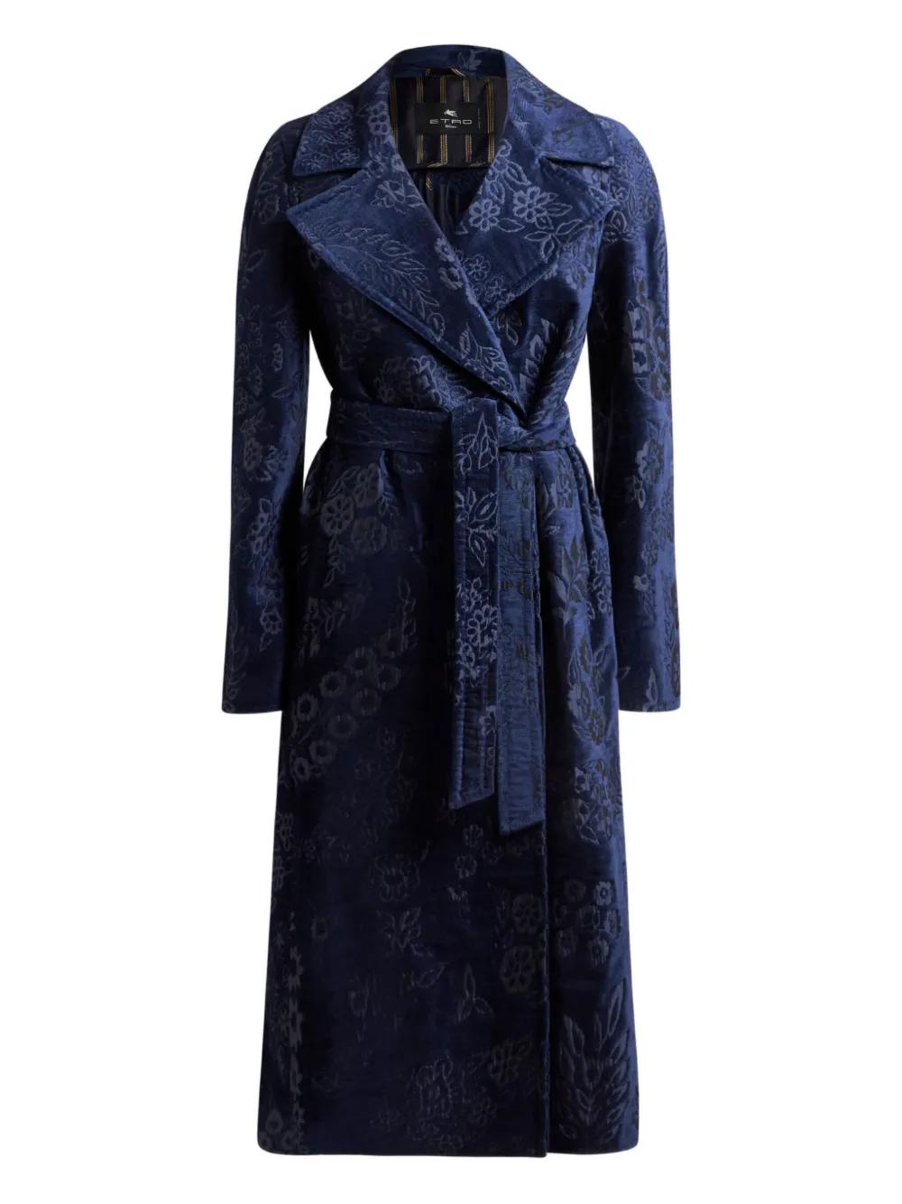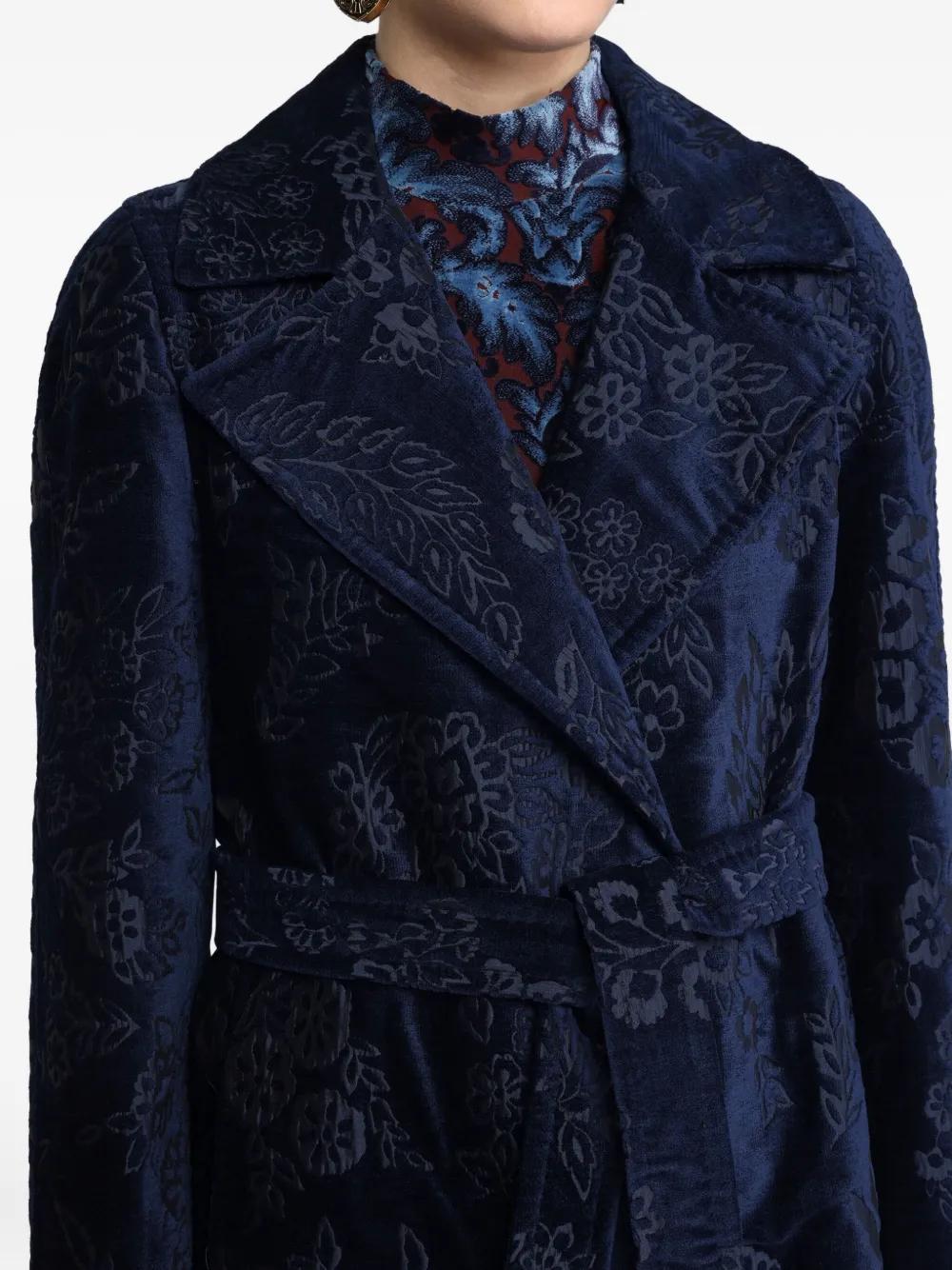 navy blue chenille fabric floral-jacquard pattern belted waist notched-lapel collar long sleeves