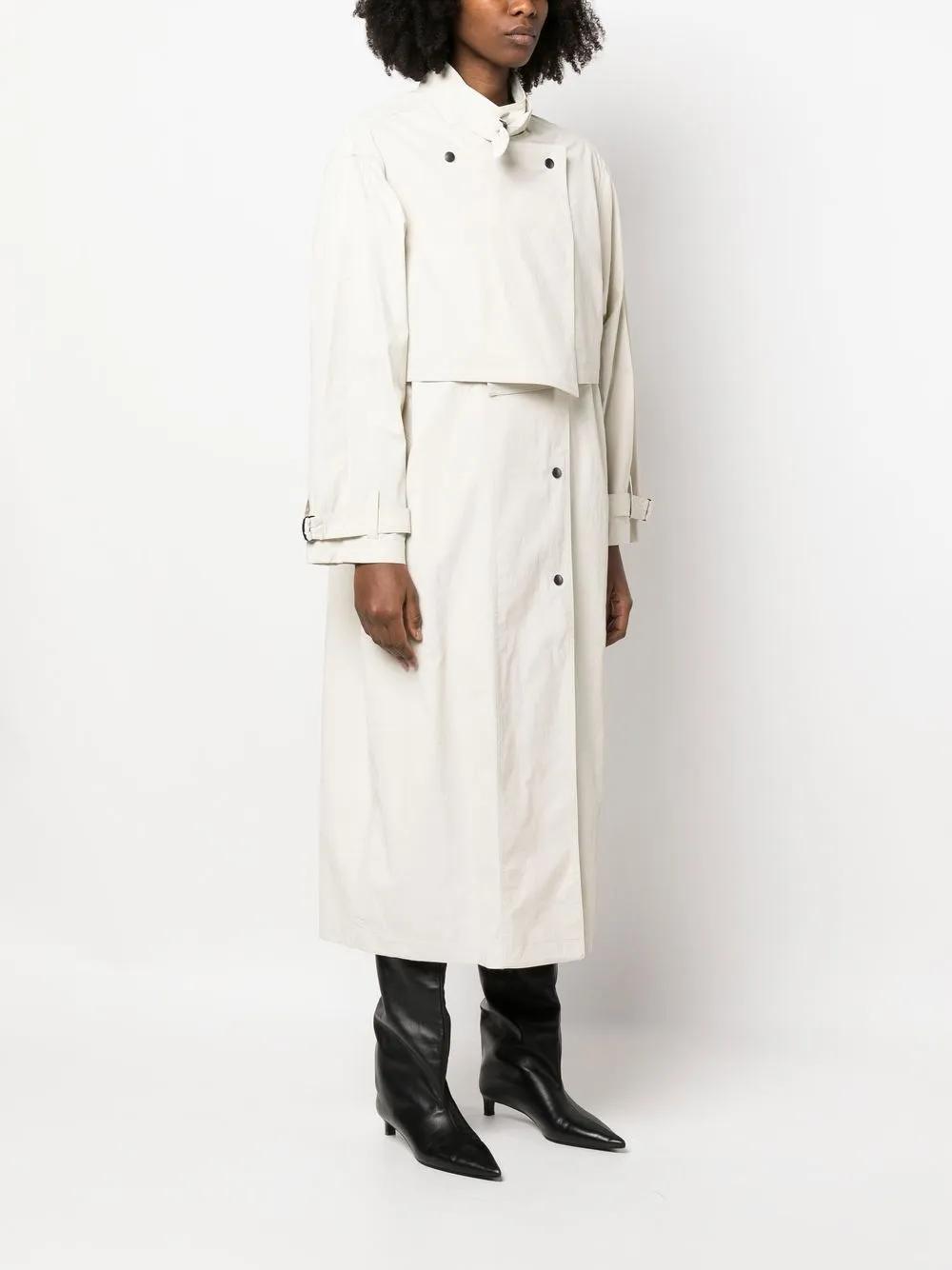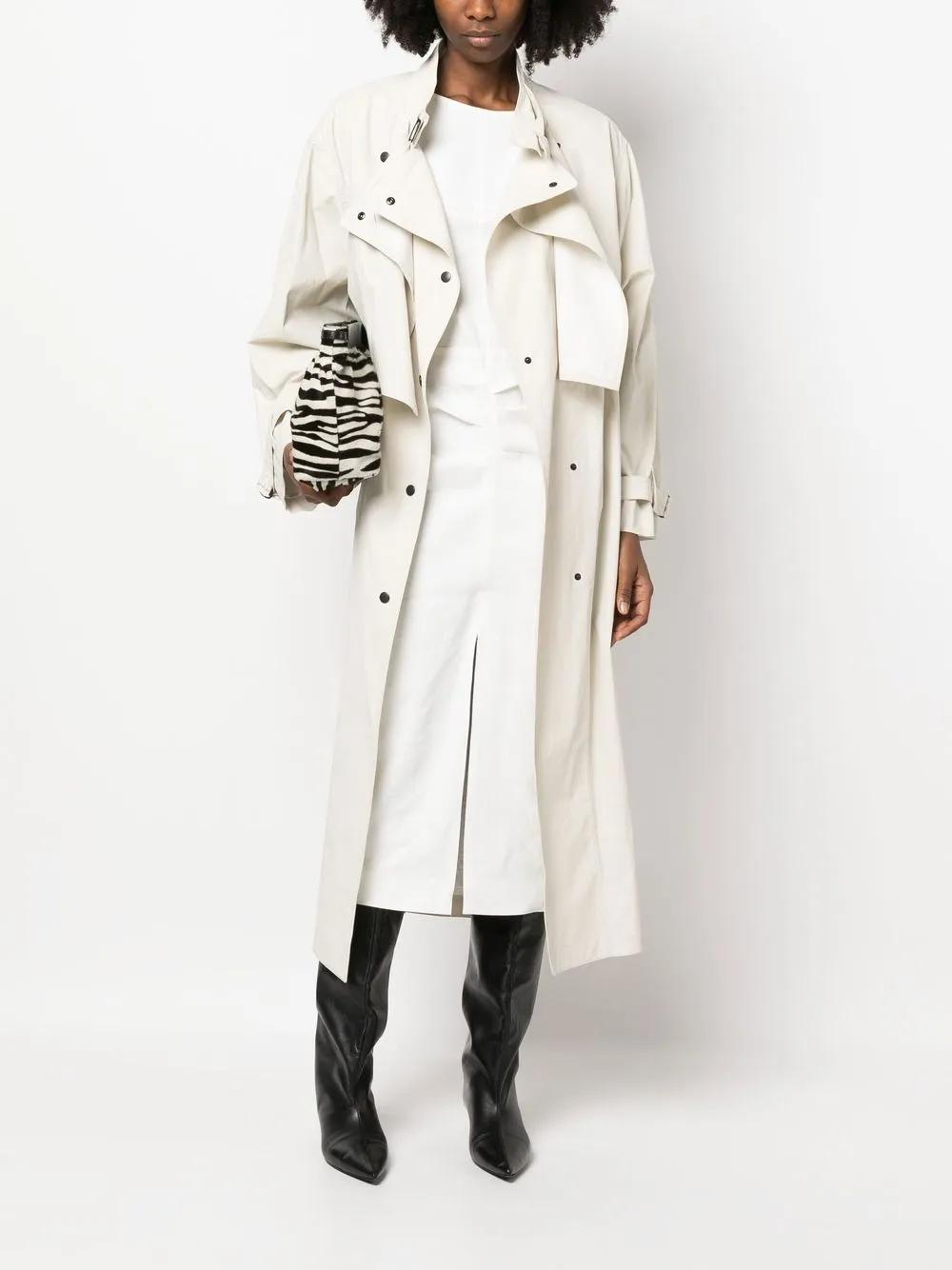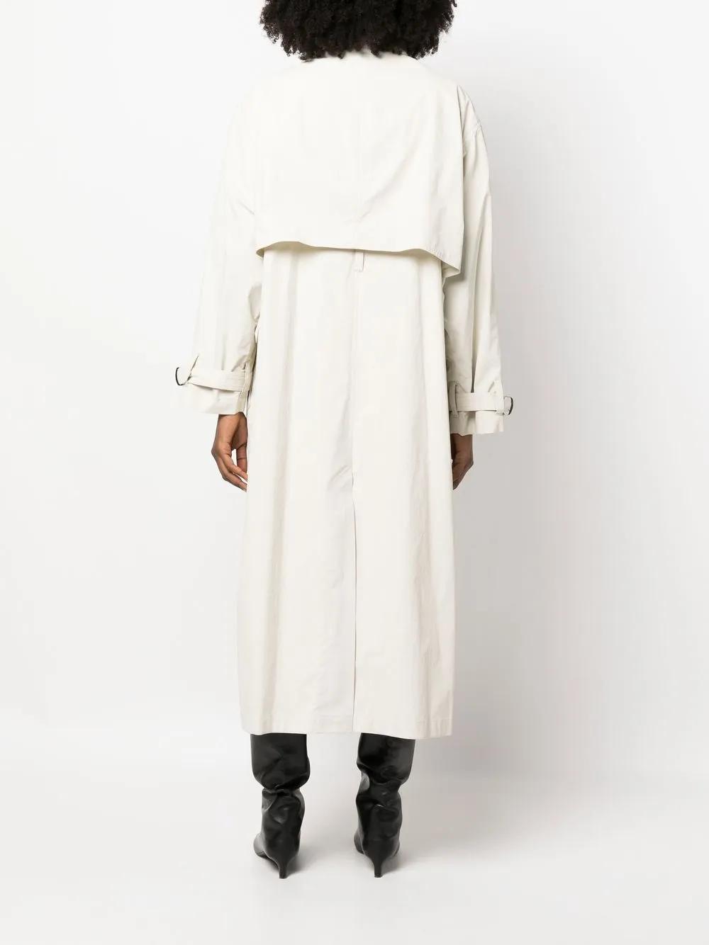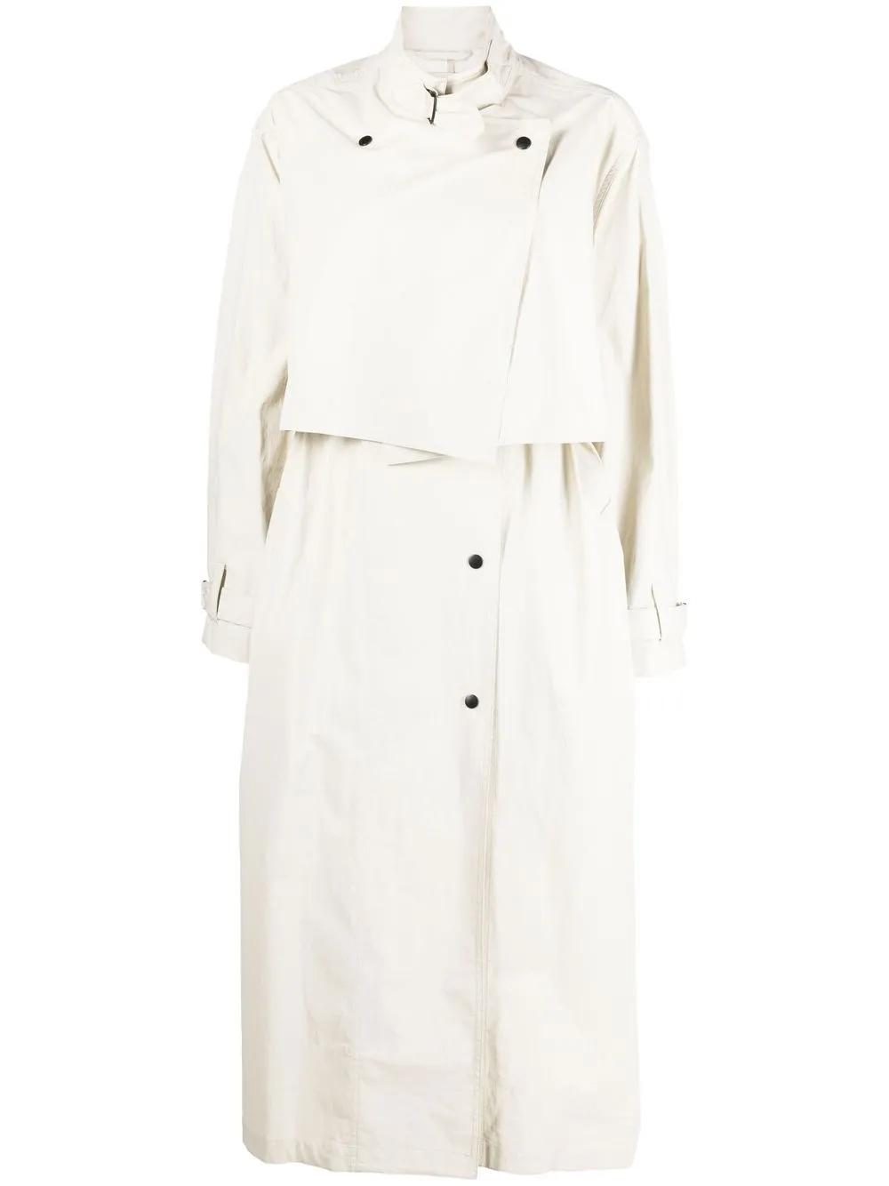 ecru cotton blend draped design adjustable neck strap off-centre front button fastening long sleeves straight hem