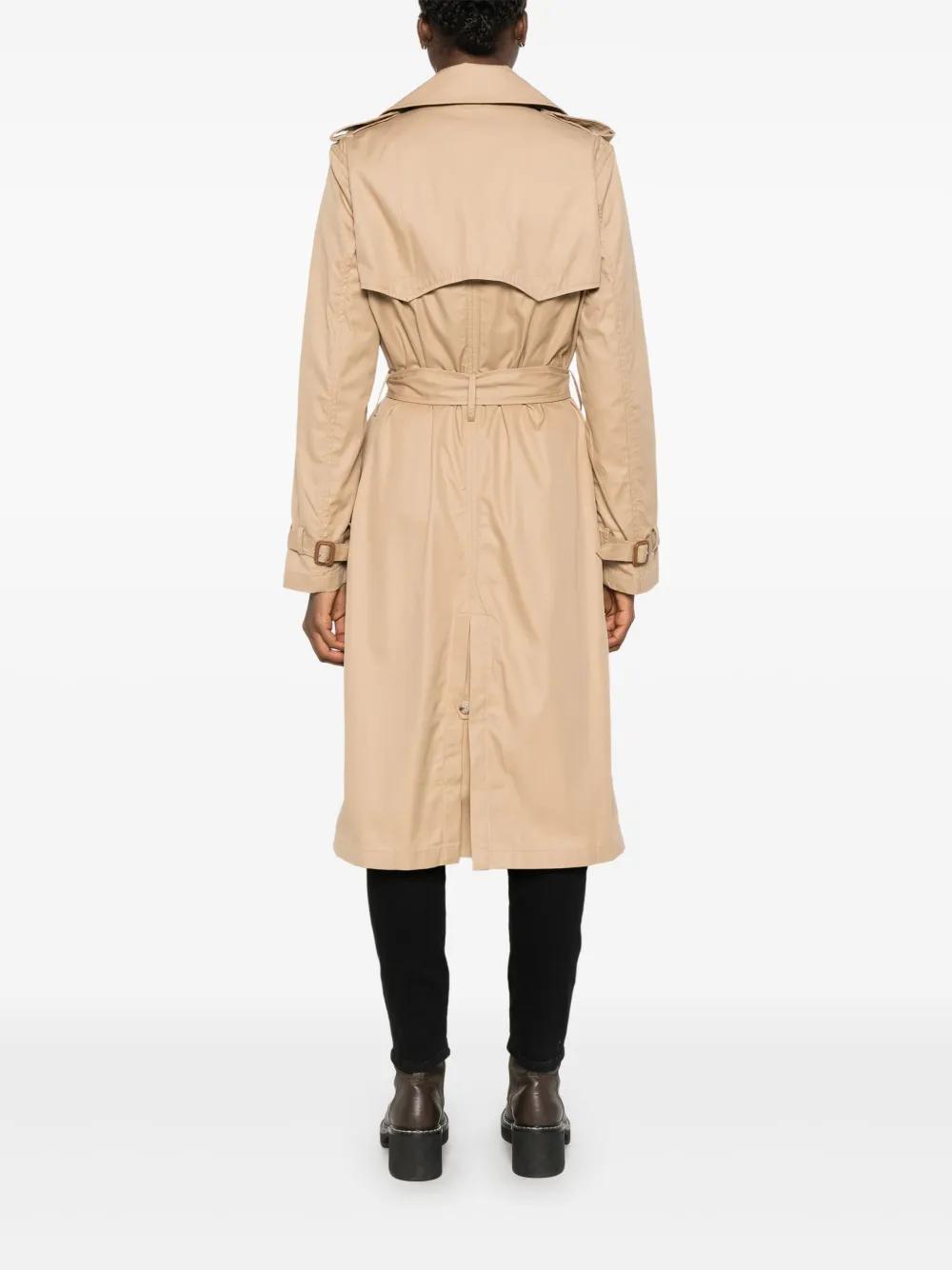 beige cotton twill weave double-breasted button fastening belted waist spread collar epaulettes long sleeves belted cuffs storm flap two side flap pockets pleat detailing straight hem mid-length