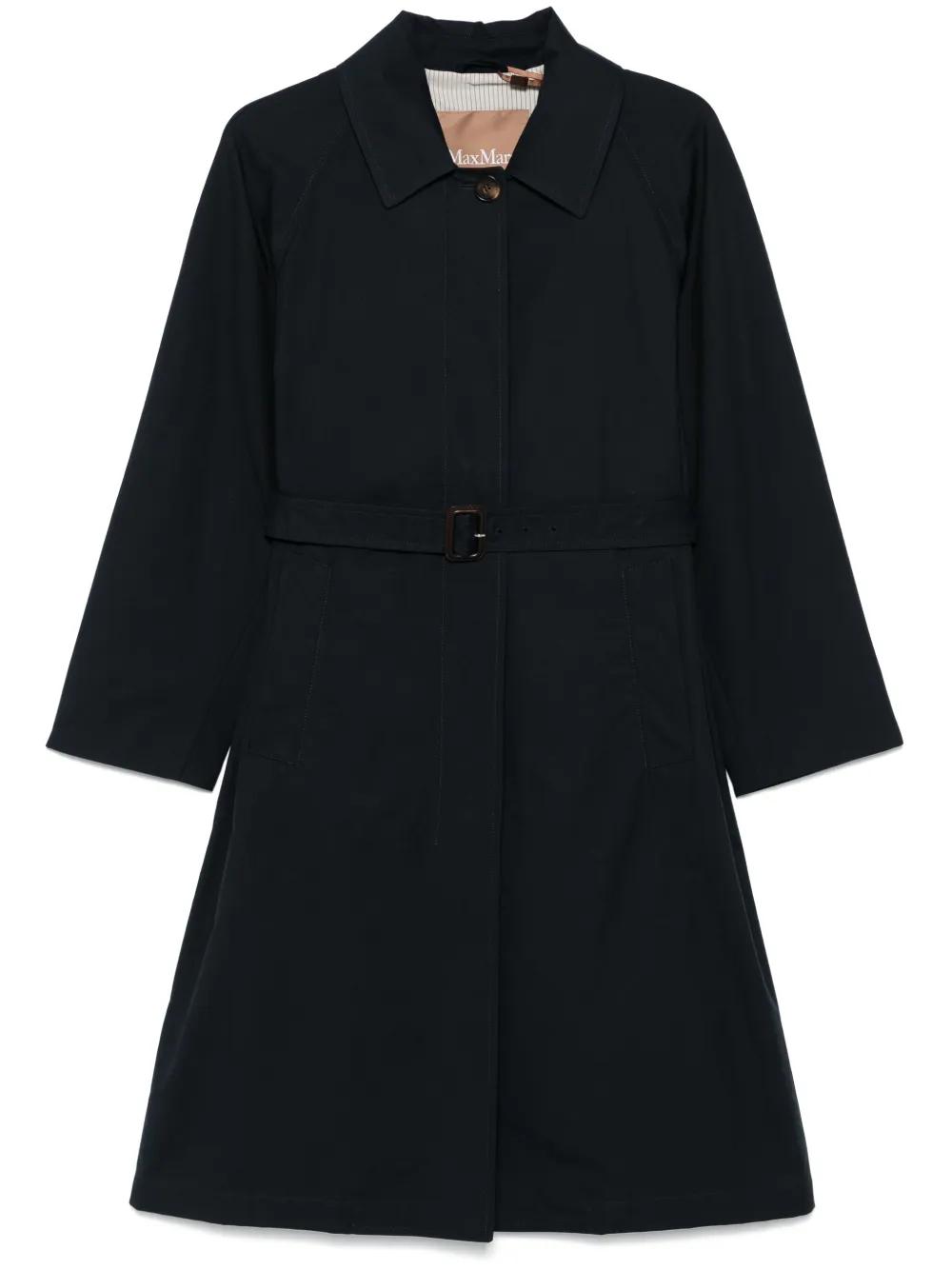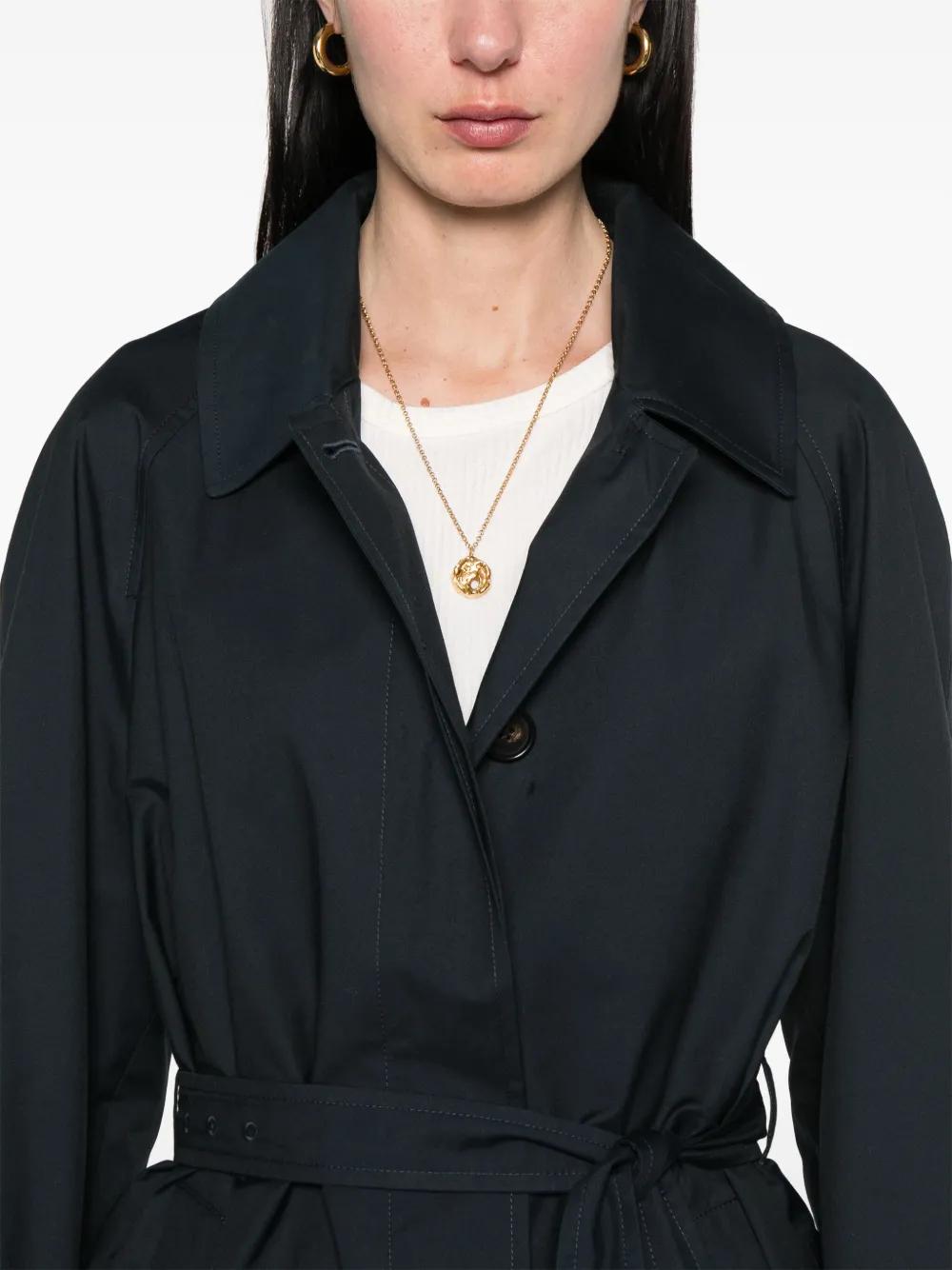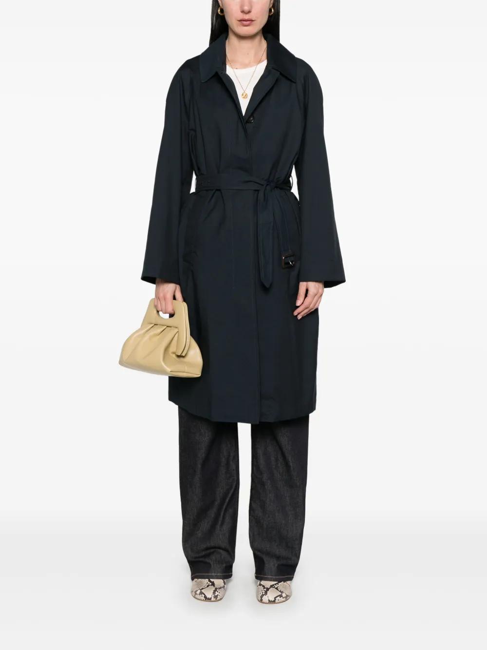 oxford blue concealed front button fastening detachable and adjustable waist belt two side welt pockets buttoned central rear vent