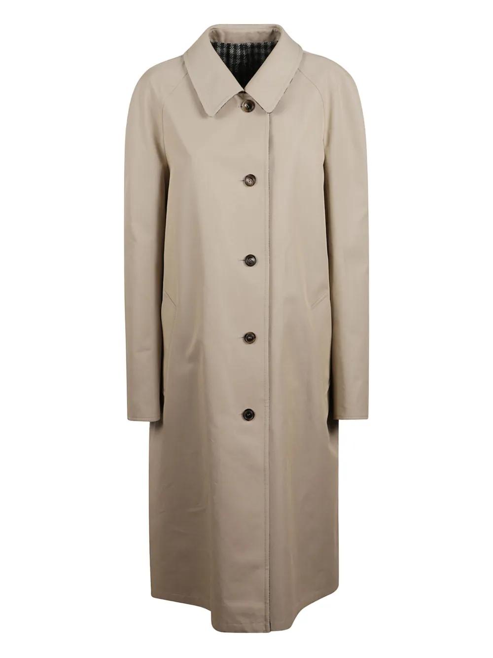 medium grey cotton canvas notched collar double-breasted button fastening epaulettes shoulder pads storm flap long sleeves belted cuffs detachable waist belt belt loops two side slit pockets buttoned central rear vent full lining straight hem maxi