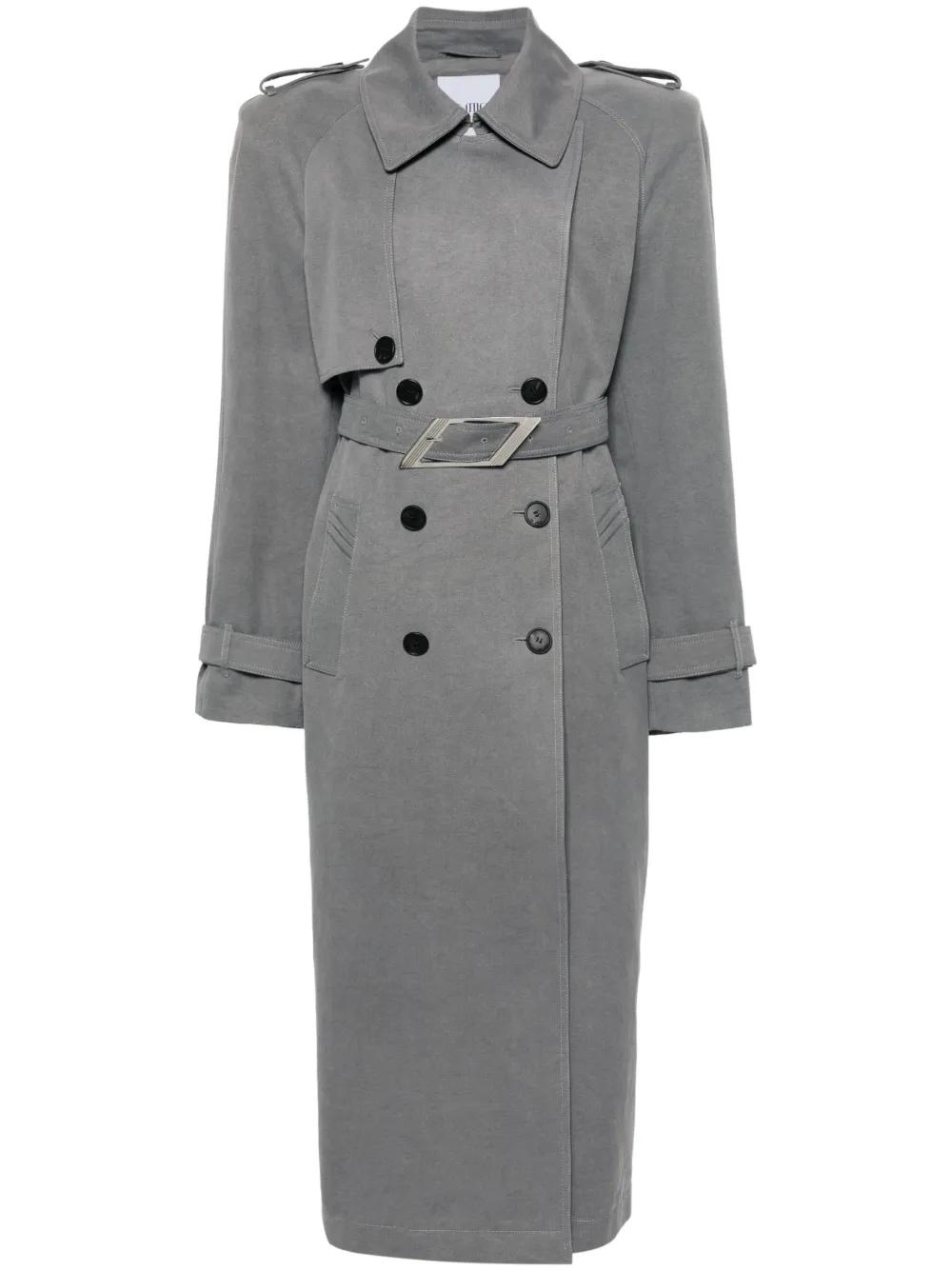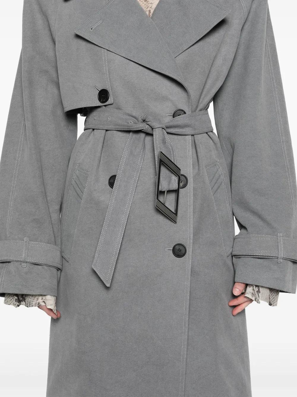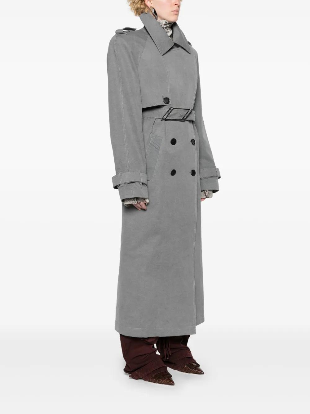 medium grey cotton canvas notched collar double-breasted button fastening epaulettes shoulder pads storm flap long sleeves belted cuffs detachable waist belt belt loops two side slit pockets buttoned central rear vent full lining straight hem maxi