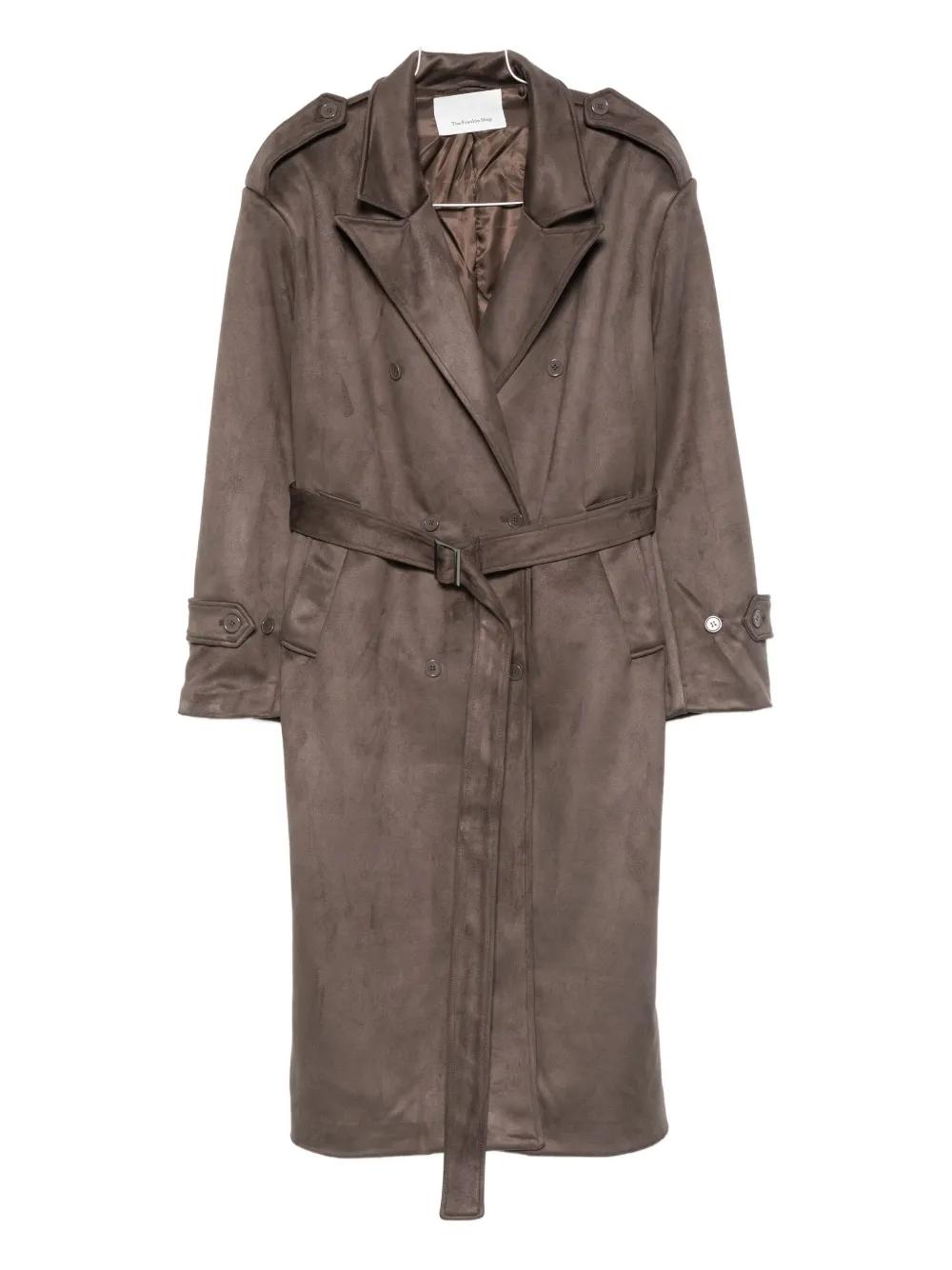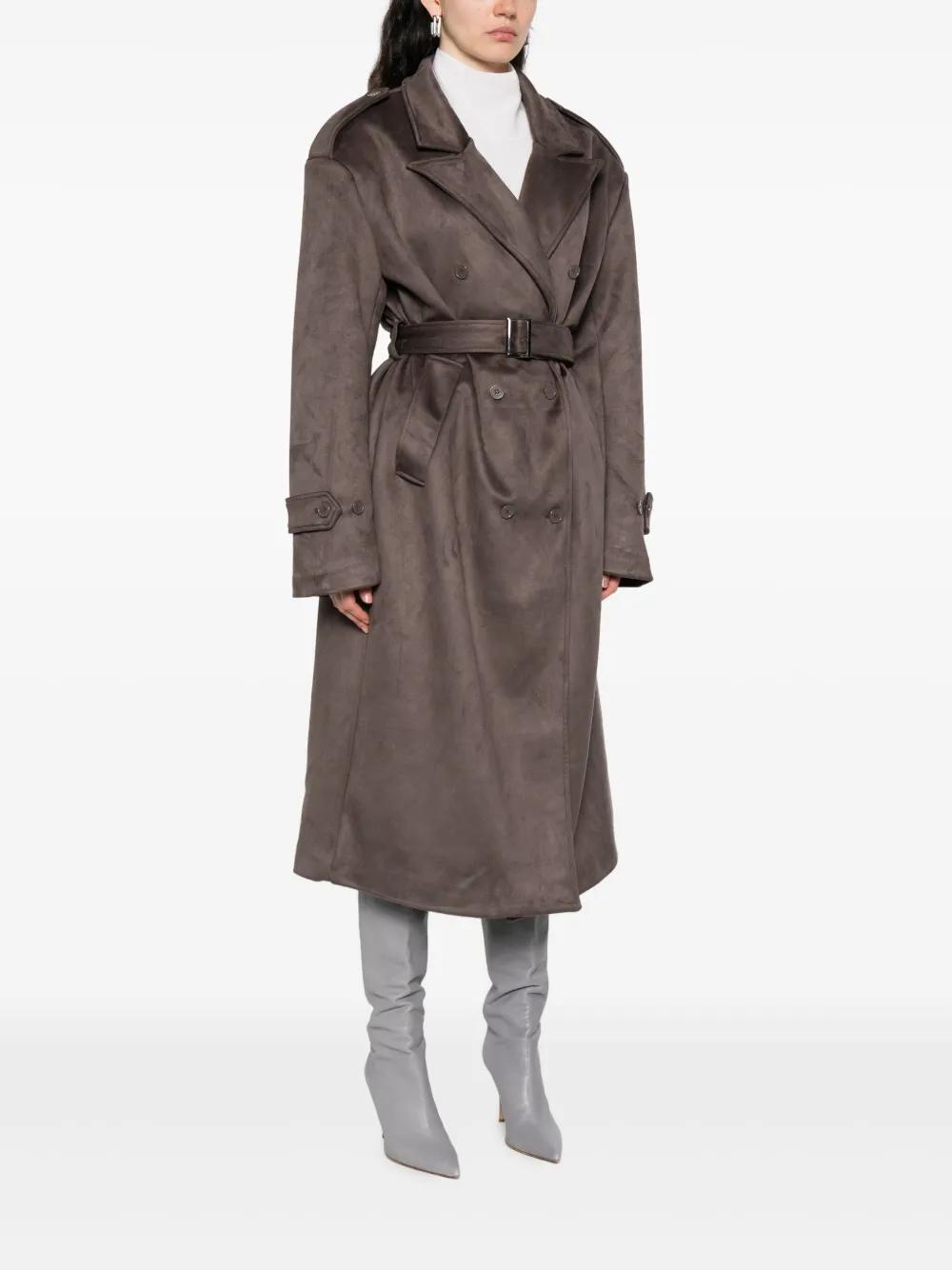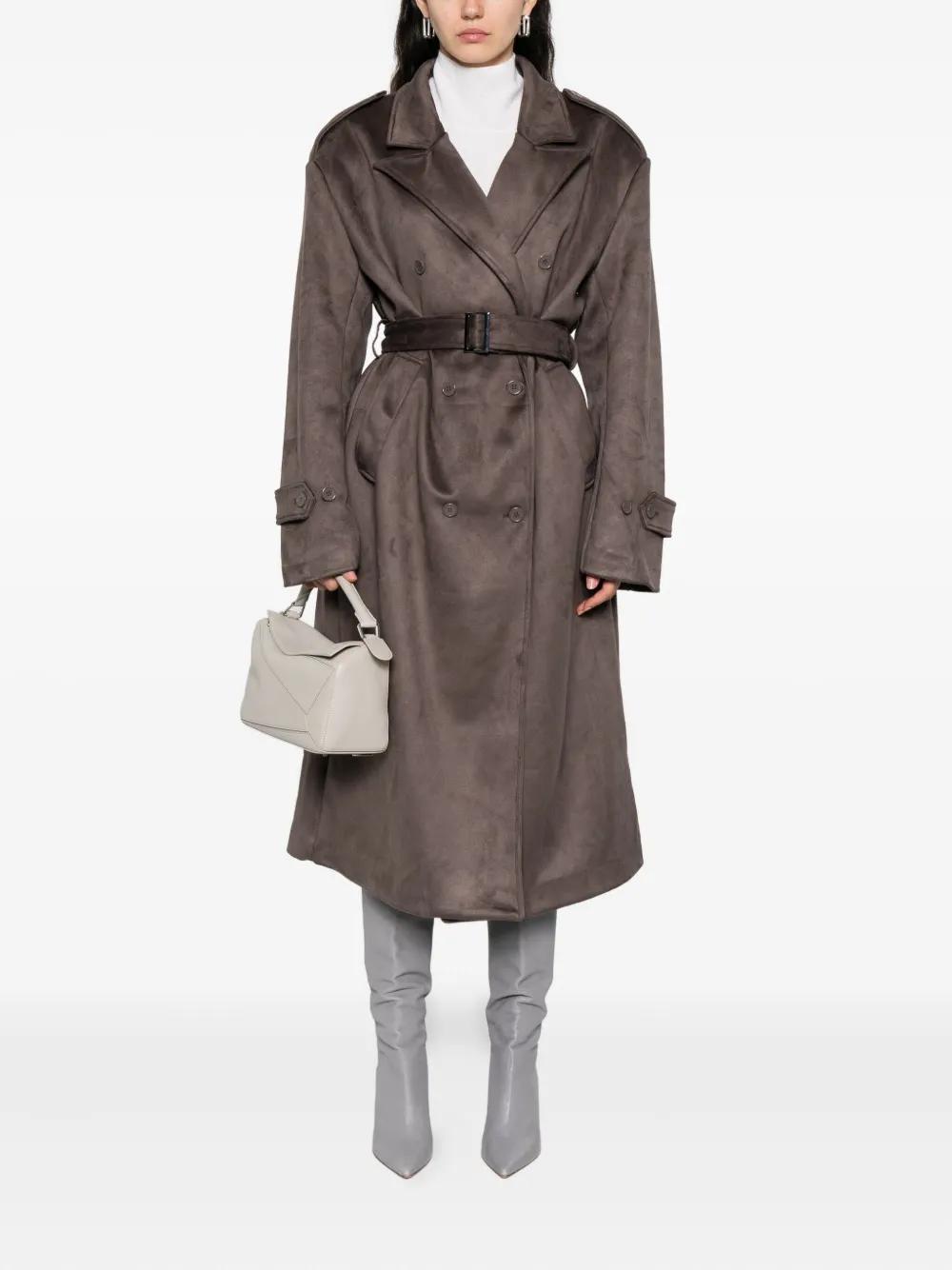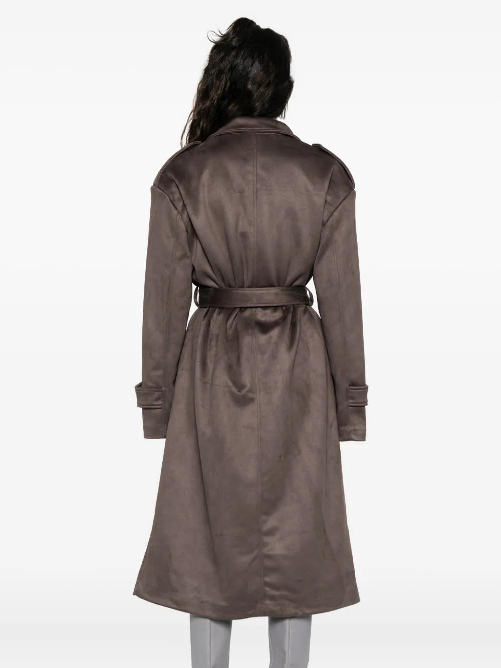 mouse grey faux suede double-breasted fastening self-tie belt long sleeves buttoned cuffs