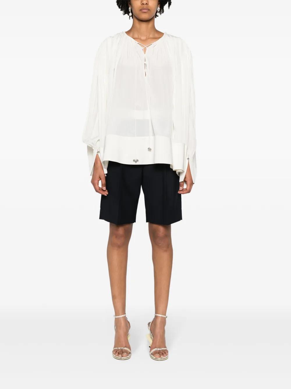 ecru semi-sheer construction gathered detailing front tie fastening drop shoulder long sleeves buttoned cuffs high-low hem