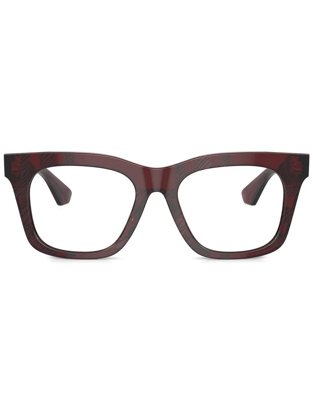 dark red acetate check pattern square frame clear lenses sculpted arms logo plaque at the arm curved tips All glasses from FARFETCH are sold as non-prescription frames. These glasses come with a protective case.