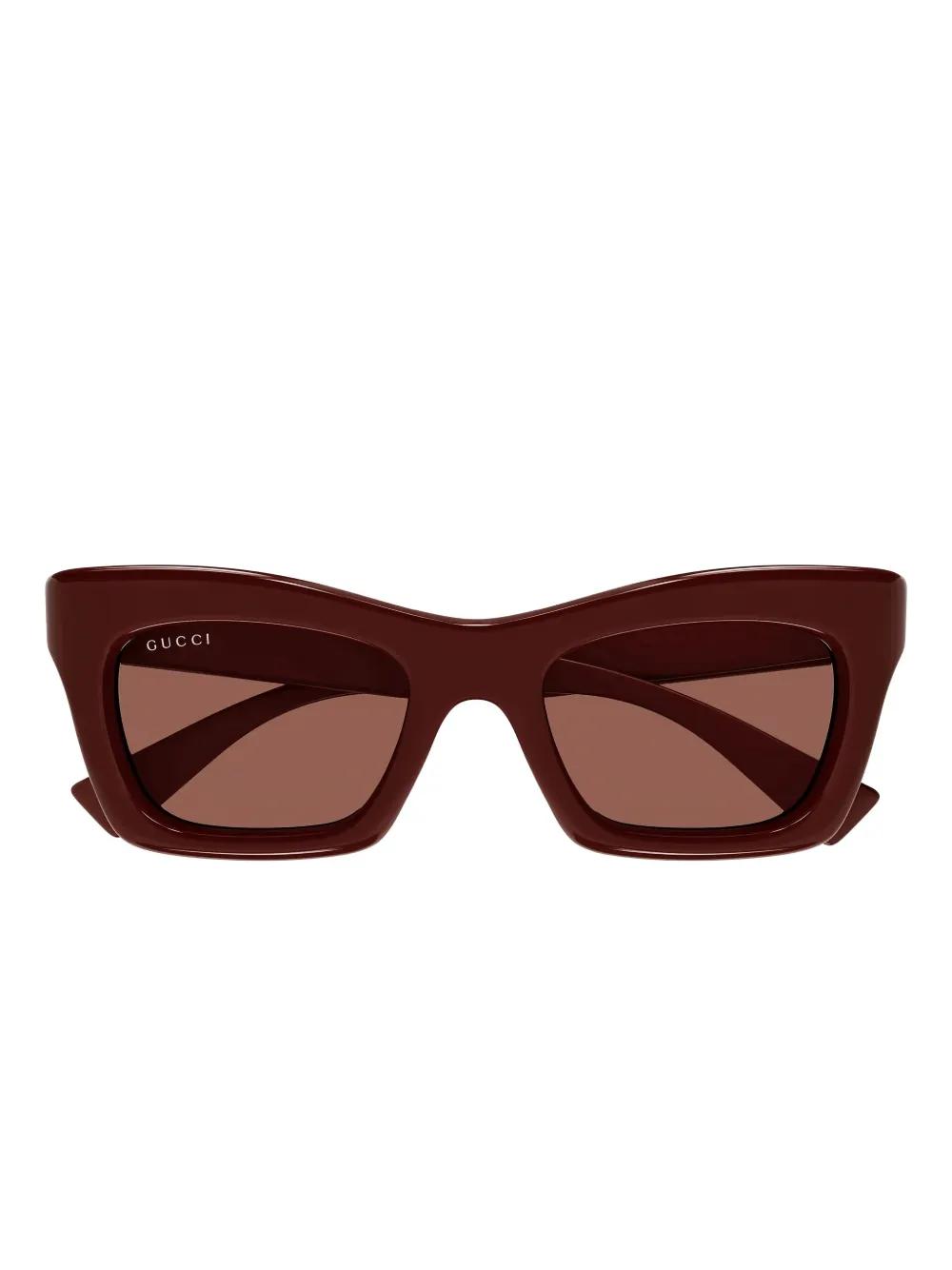 burgundy red square frame brown lenses full rim logo detail shiny finish These glasses come with a protective case.