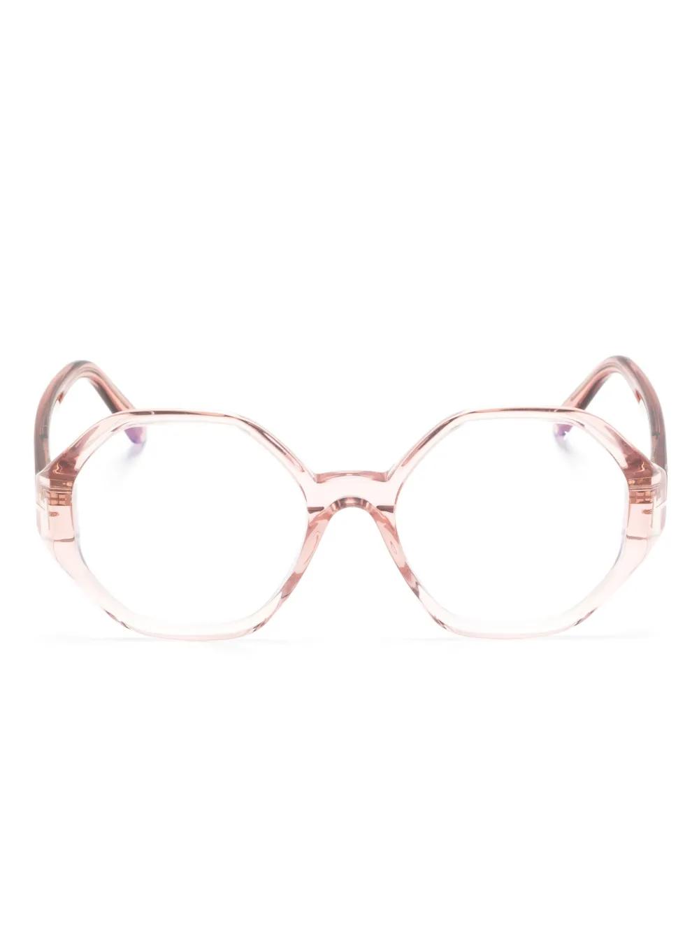 light pink acetate geometric frame clear lenses logo plaque at the arm sculpted arms and curved tips These glasses come with a protective case. All glasses from FARFETCH are sold as non-prescription frames.