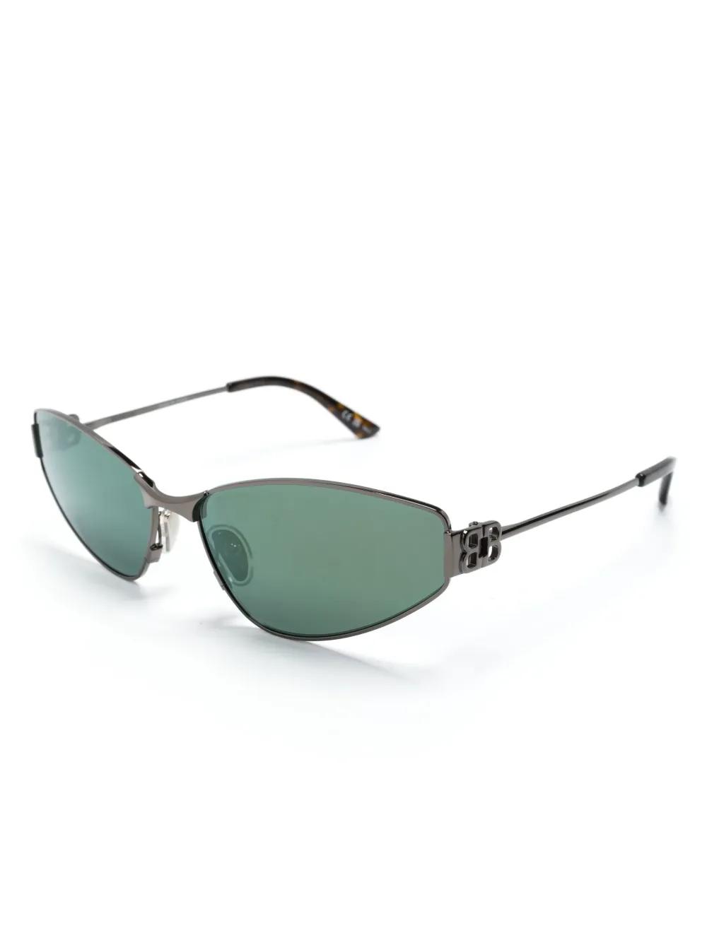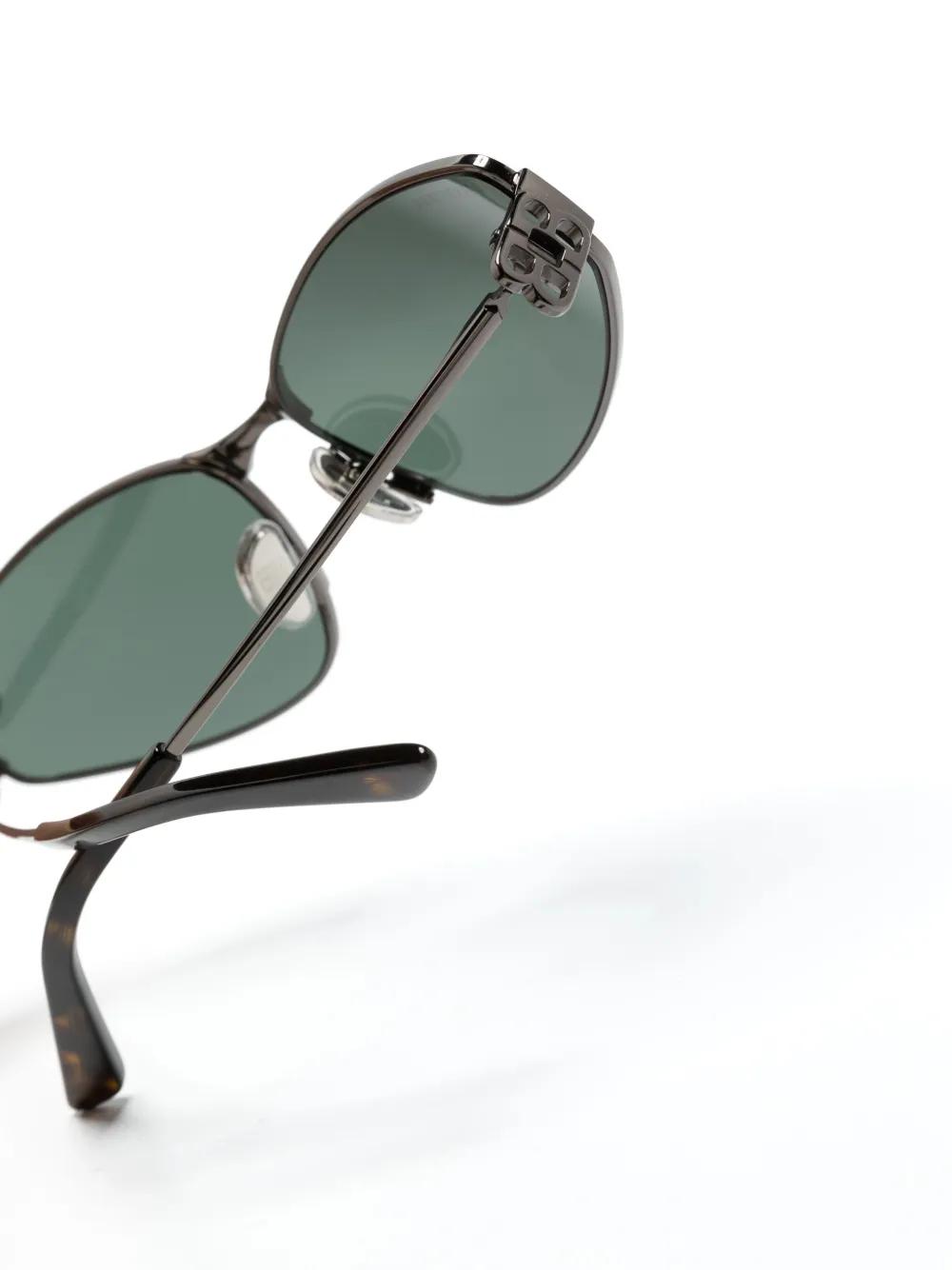 silver-tone metal cat-eye frame green tinted lenses nose pads BB logo plaque at the arm straight arms with curved tips These glasses come with a protective case.