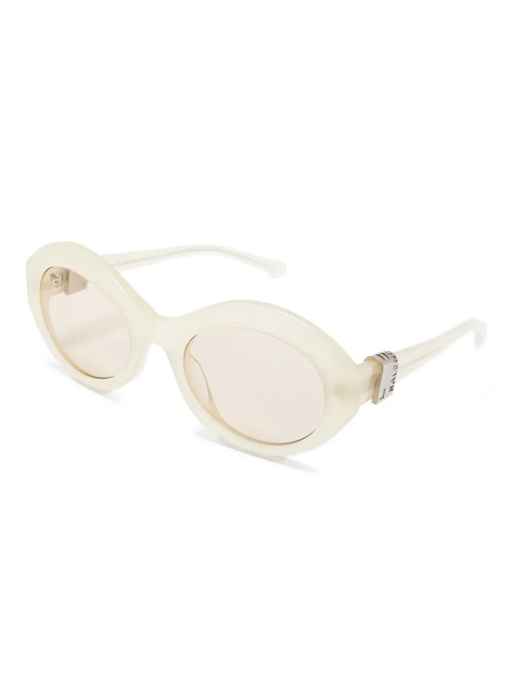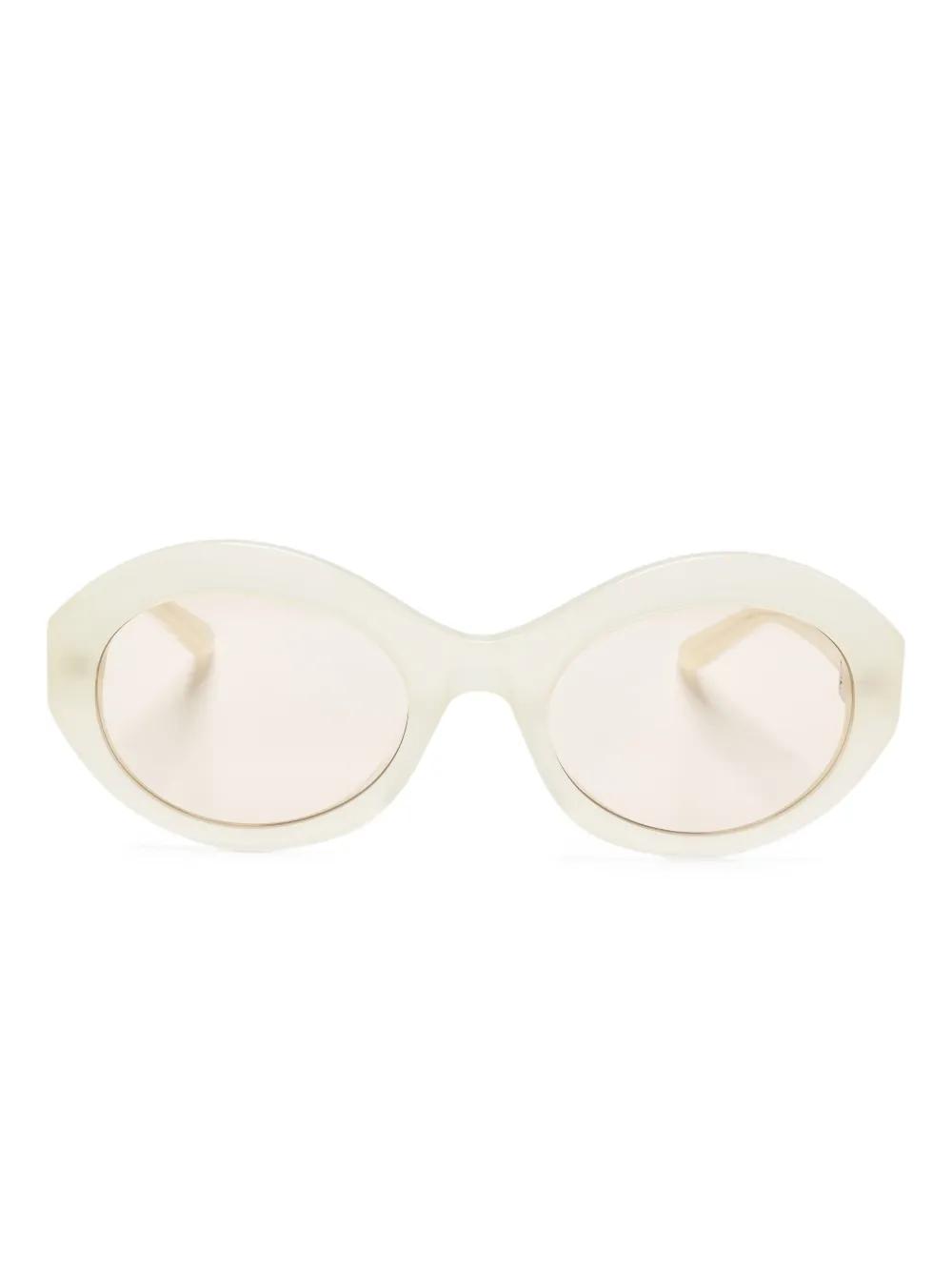 white oval frame tinted lenses logo detail These glasses come with a protective case.