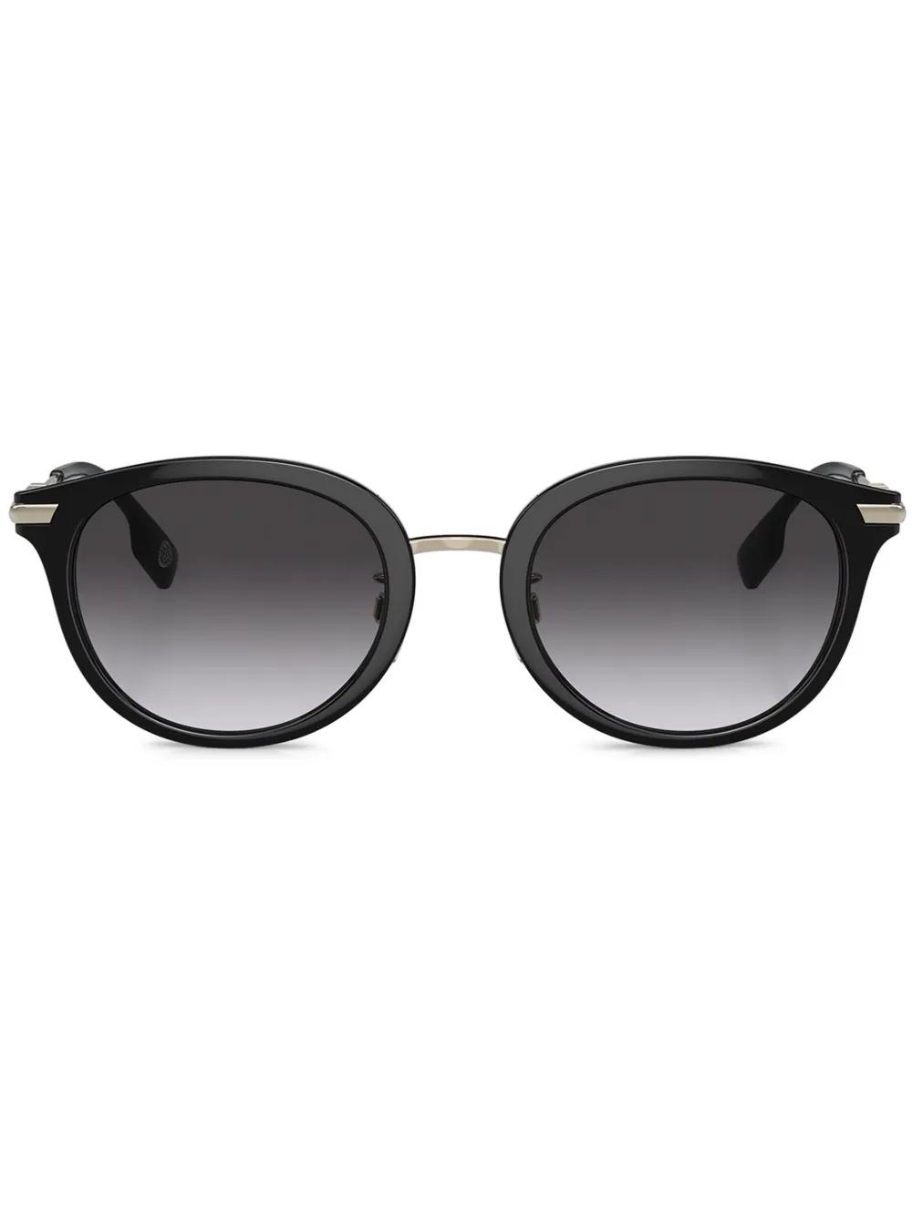 black acetate round frame tinted lenses logo plaque at the arm straight arms curved tips These glasses come with a protective case.