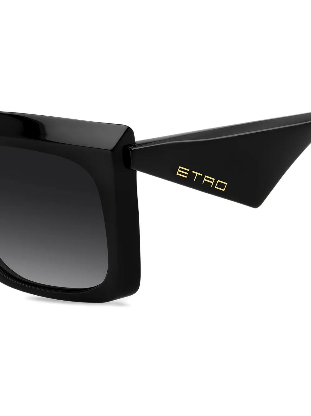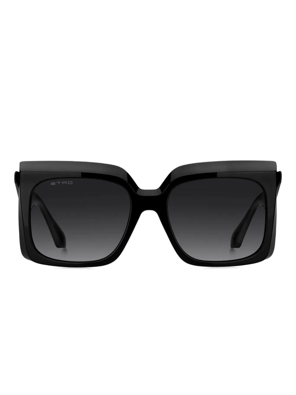 black square frame gradient lenses angular arms etched branding subtle detailing These glasses come with a protective case.