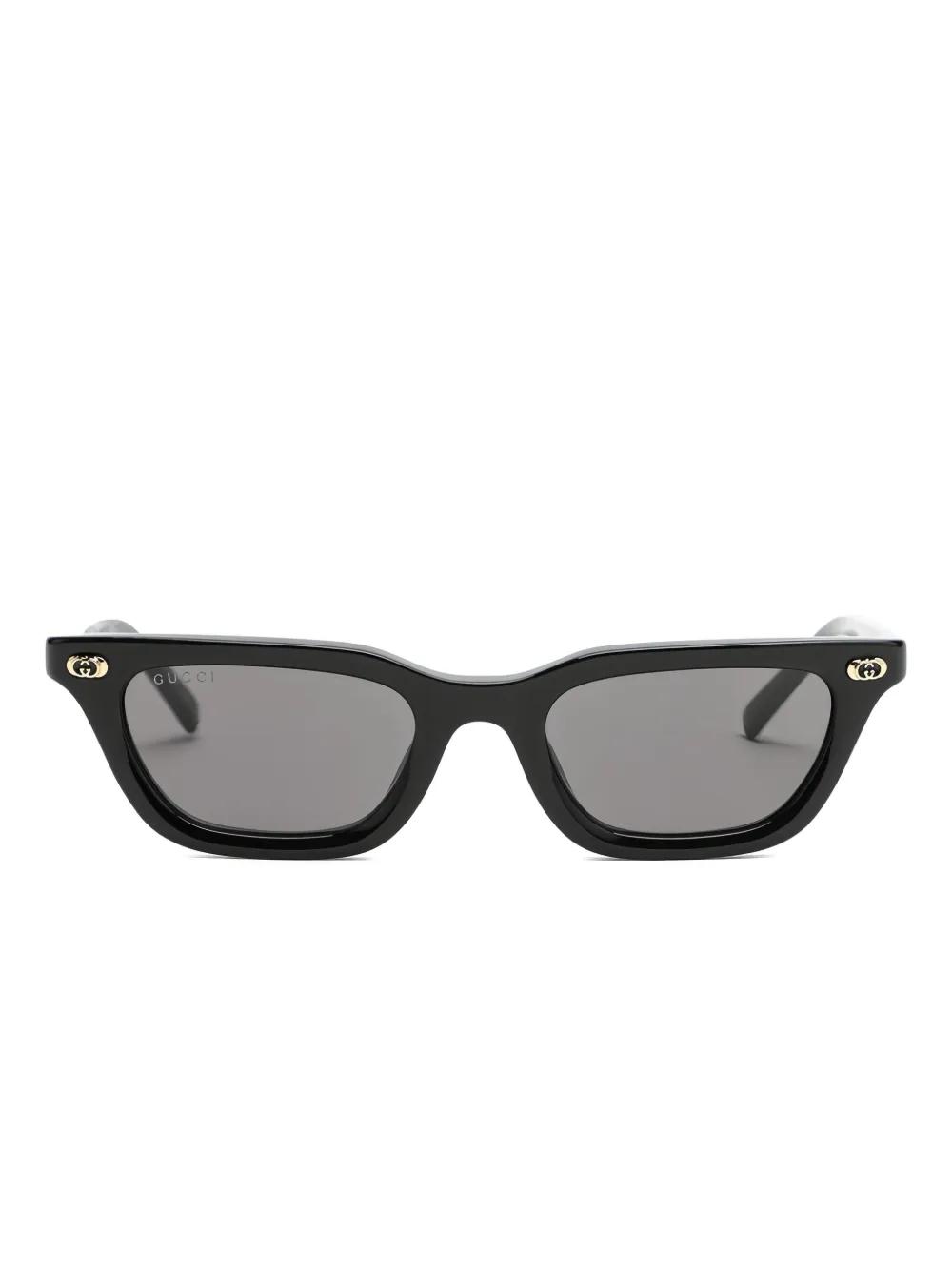 black square frame special rivets gold-tone logo grey lenses These glasses come with a protective case.