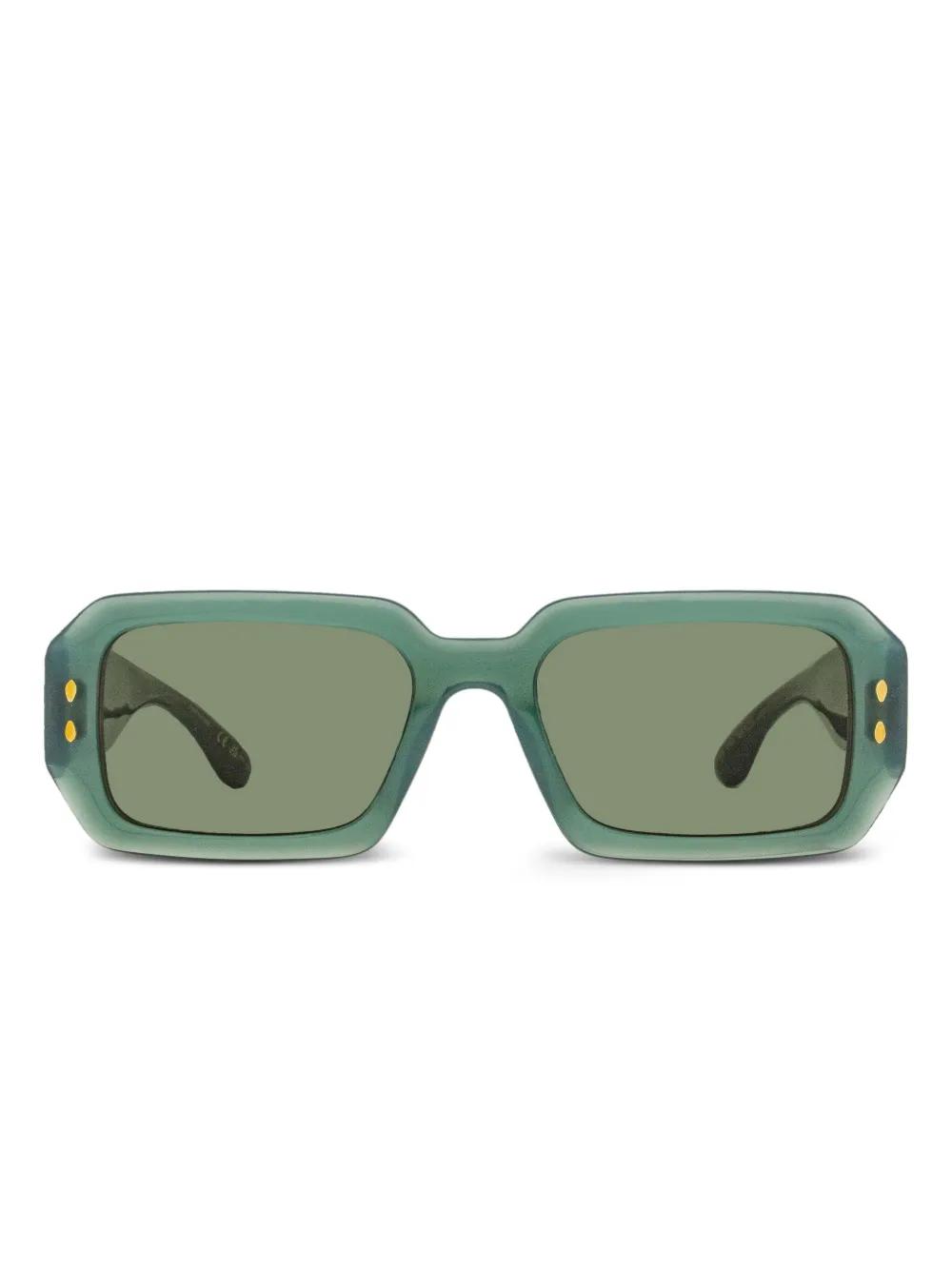 green rectangular frame tinted lenses logo detail These glasses come with a protective case.