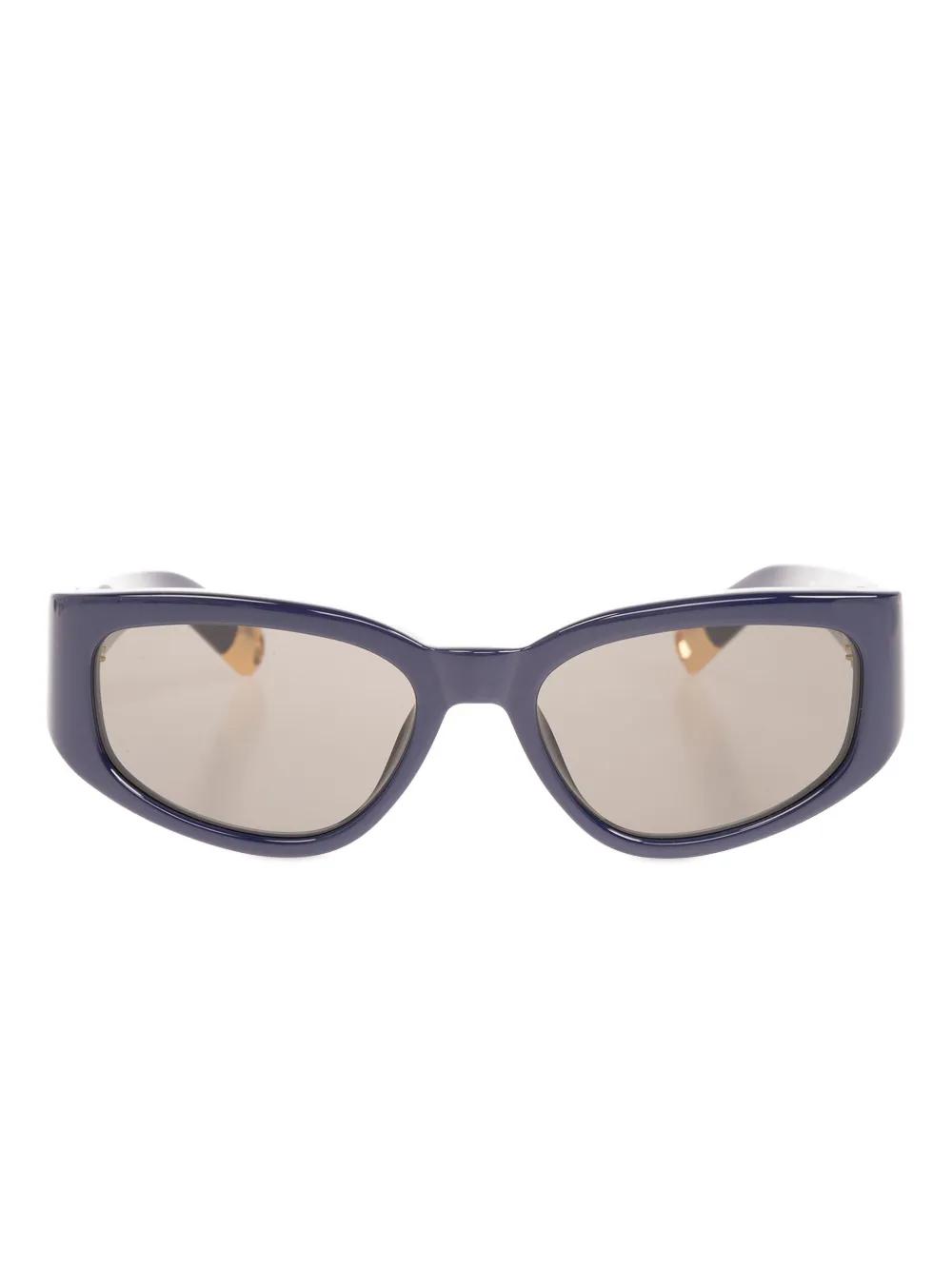 navy blue oval frame straight arms curved tips These glasses come with a protective case.