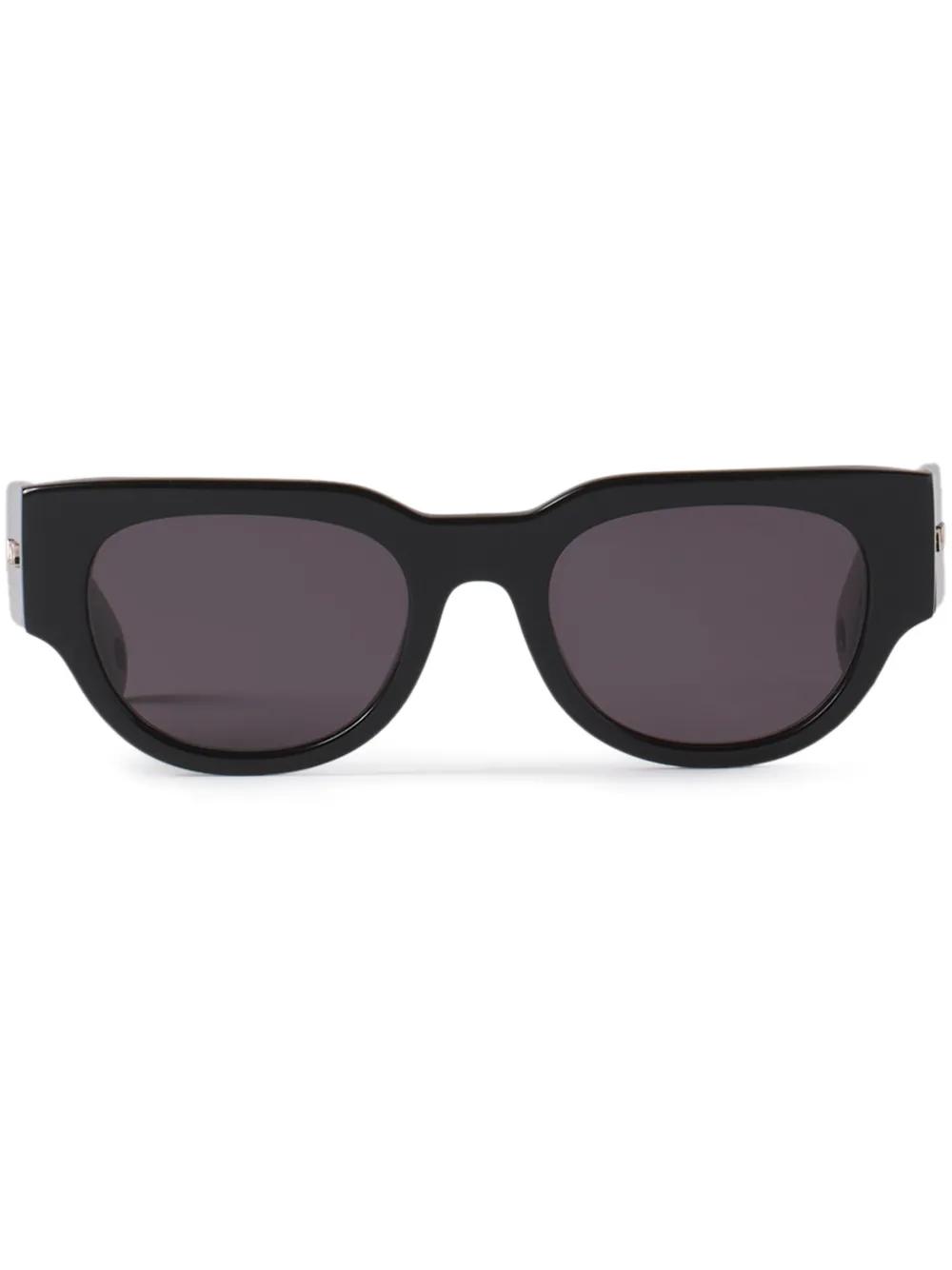black acetate geometric frame silver-tone logo lettering grey tinted lenses UV-protective lenses sculpted arms curved tips metal eyelet detailing These glasses come with a protective case.