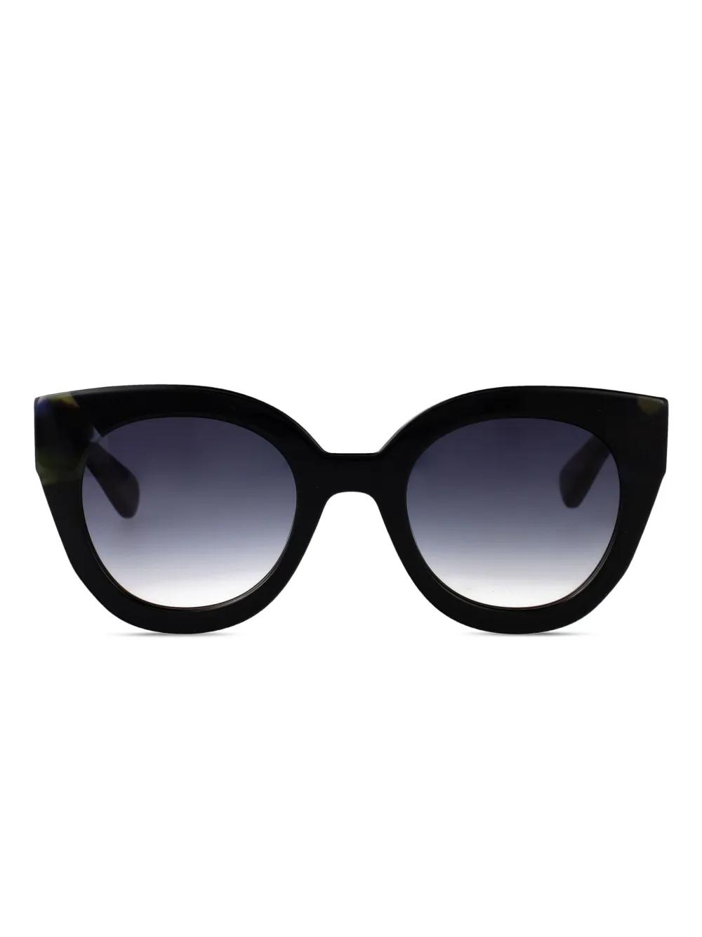 black cat-eye frame gradient lenses logo temple-detail These glasses come with a protective case.
