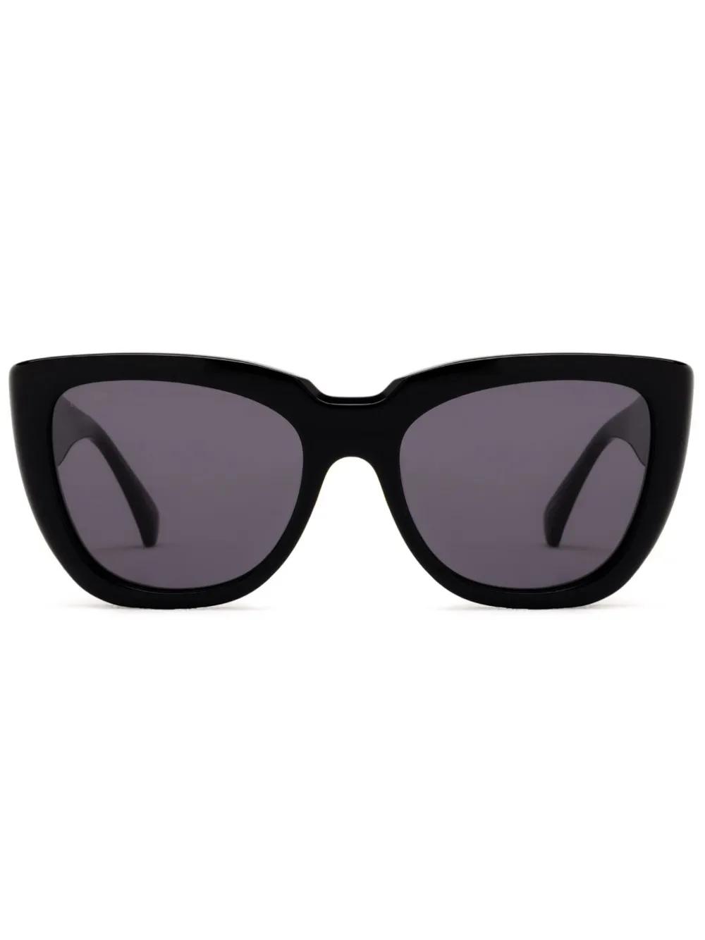 black acetate cat-eye frame grey tinted lenses UV-protective lenses logo-engraved arm straight arms curved tips These glasses come with a protective case.