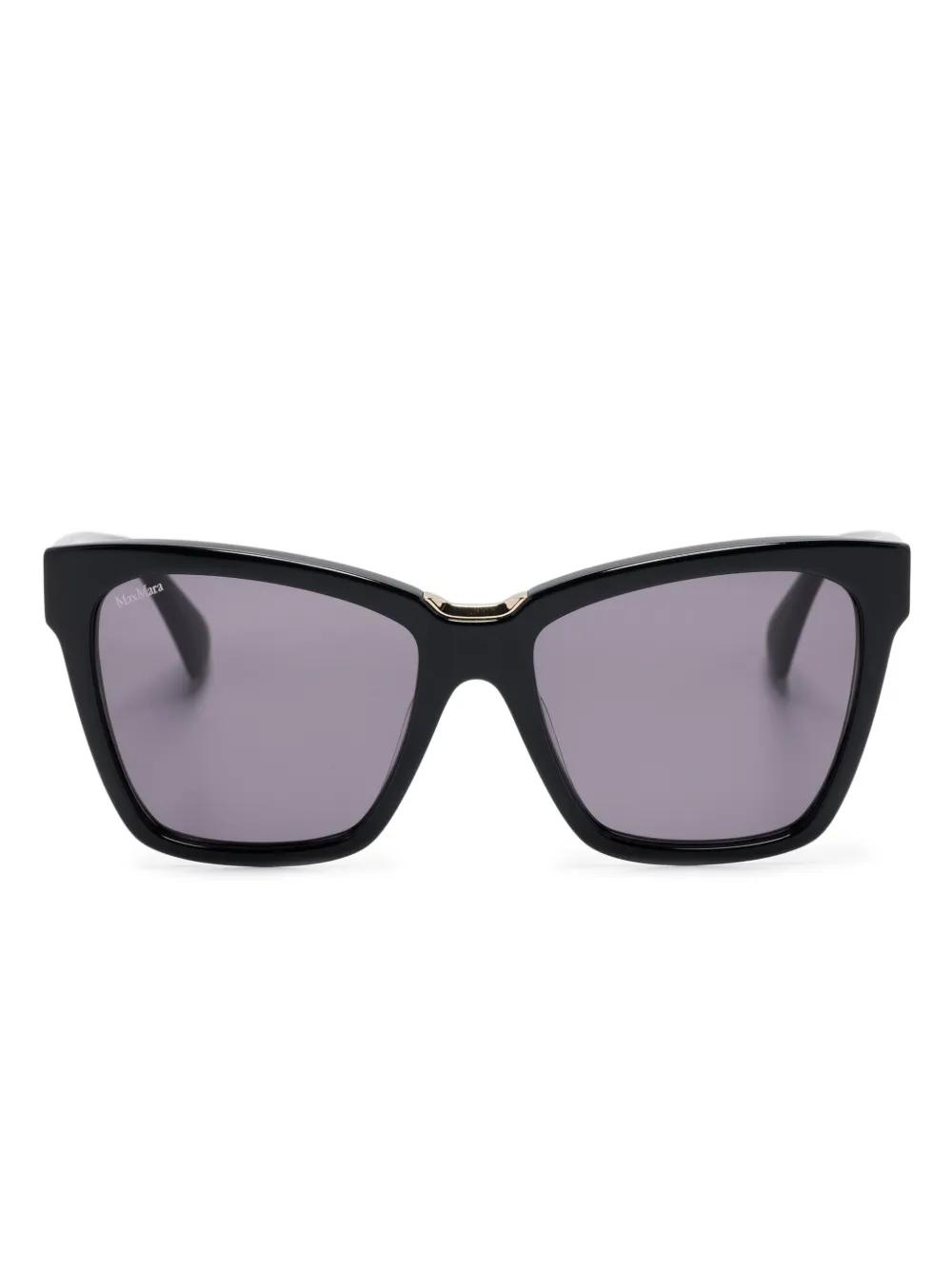 black acetate square frame grey tinted lenses logo lens decal gold-tone hardware to the bridge gold-tone logo lettering to the arm straight arms with curved tips These glasses come with a protective case.