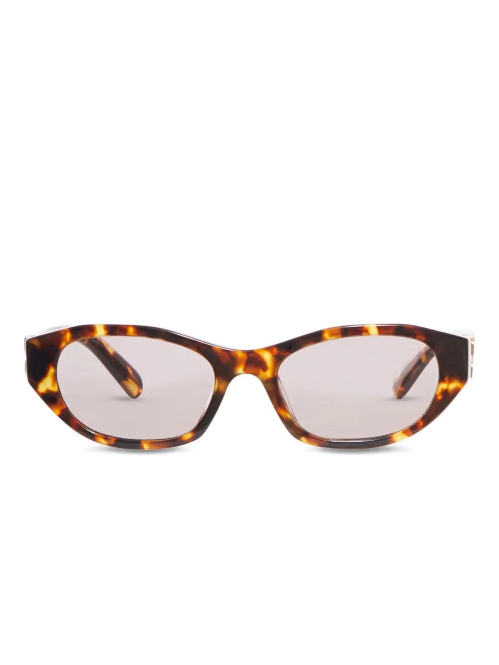 medium brown tortoiseshell effect square frame brown tinted lenses nose pads logo-engraved arm sculpted arms curved tips These glasses come with a protective case.