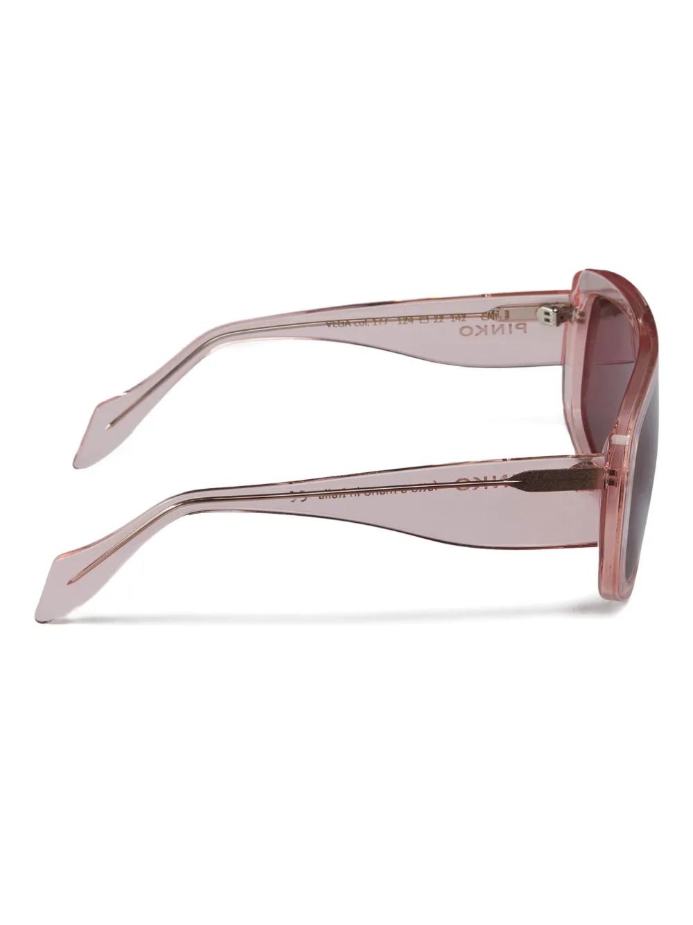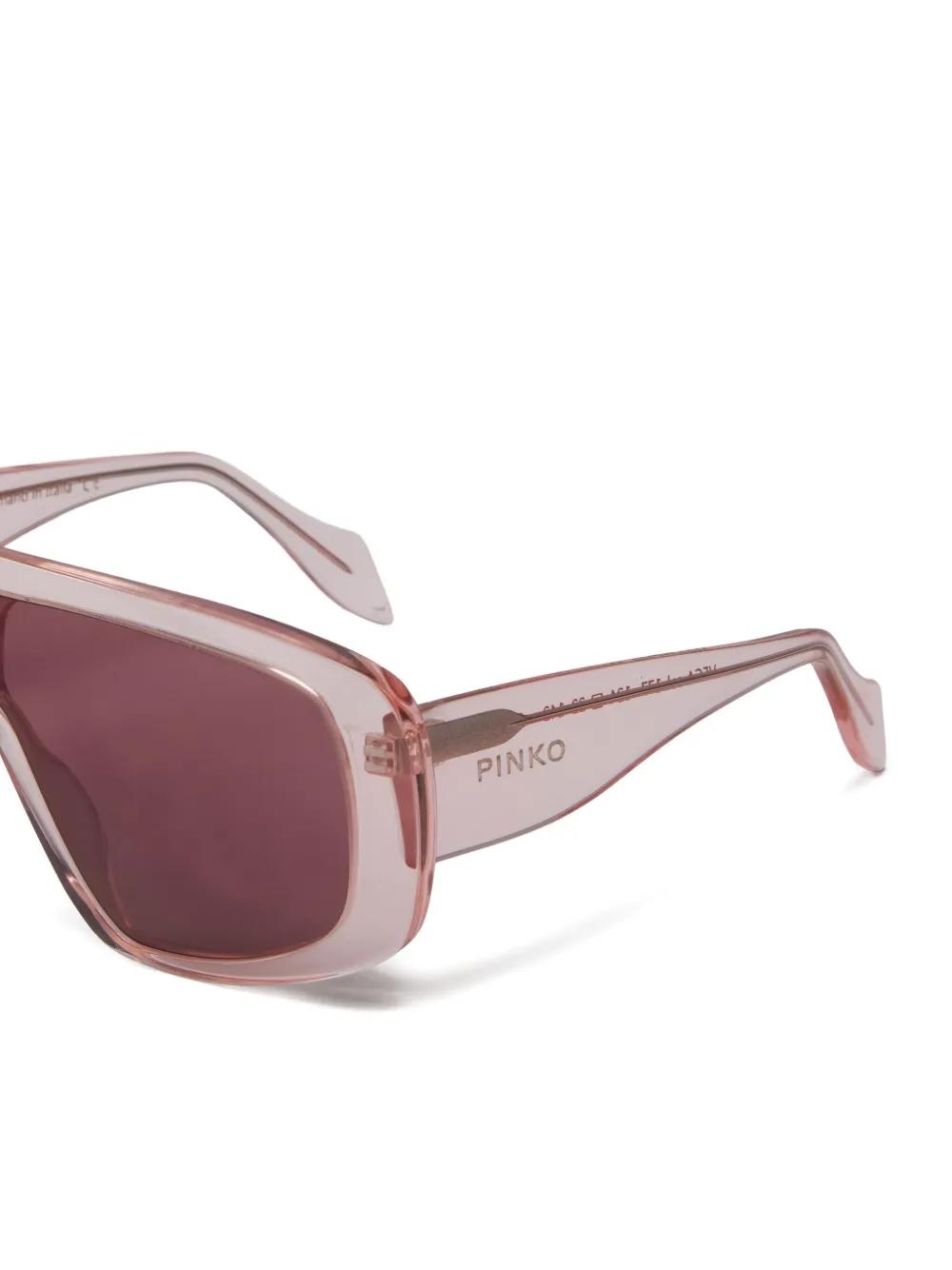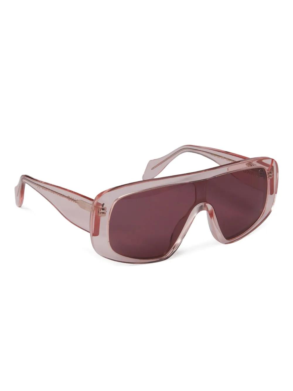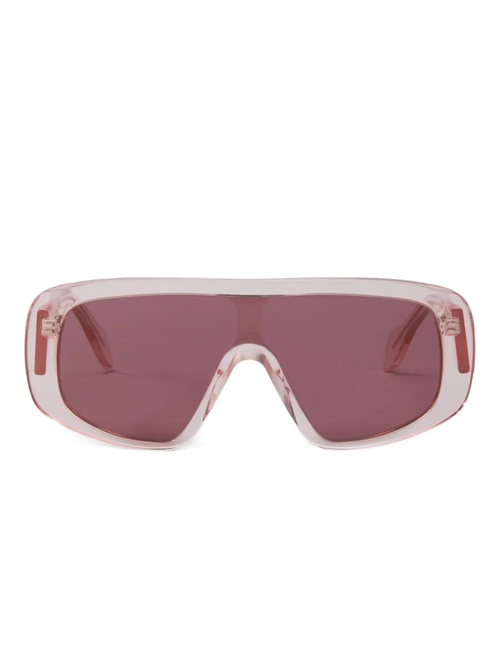 pink shield frame acetate material flat lenses curved arms subtle detailing These glasses come with a protective case.