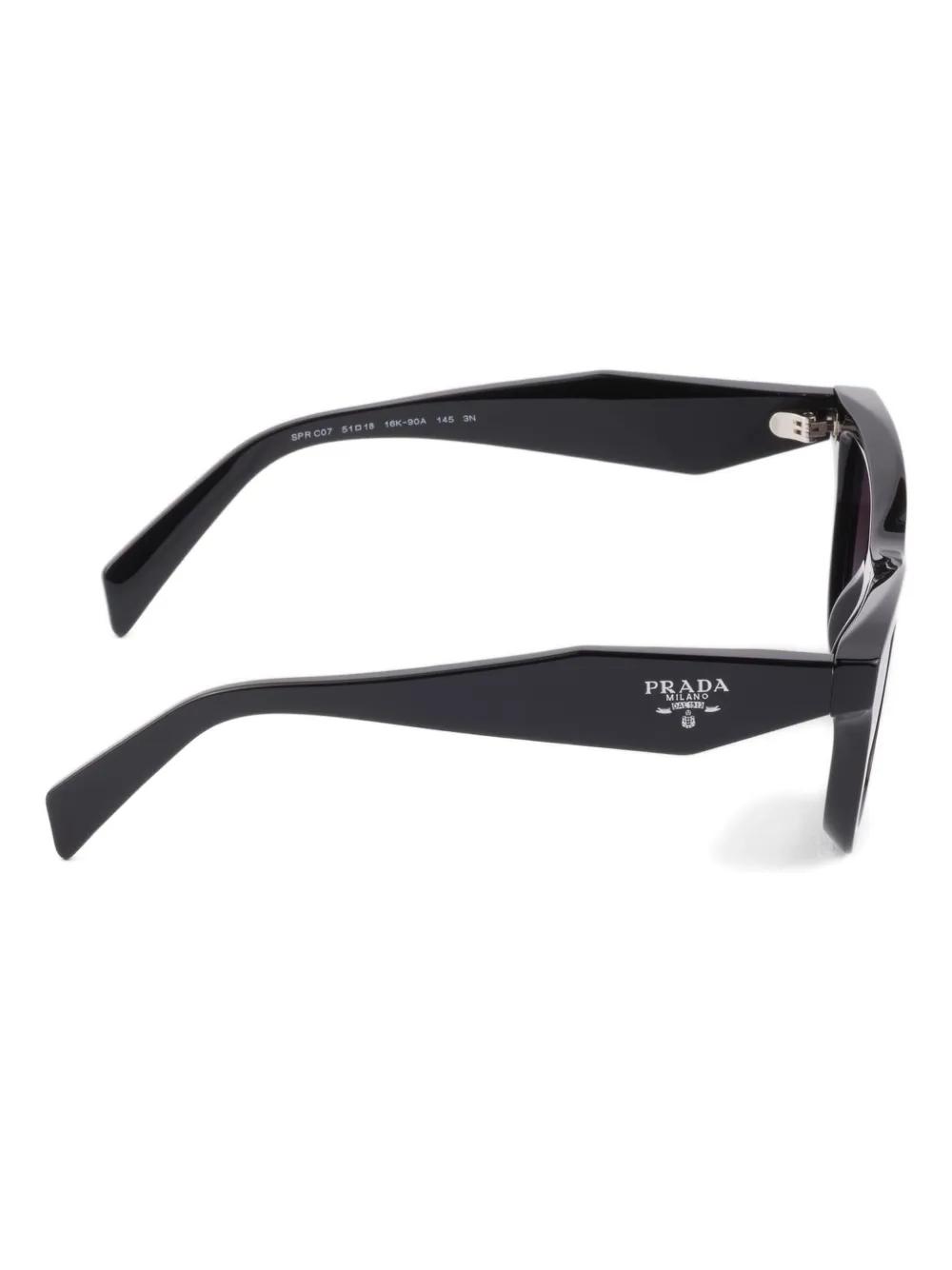 black rectangle frame purple tinted lenses curved tips These glasses come with a protective case.