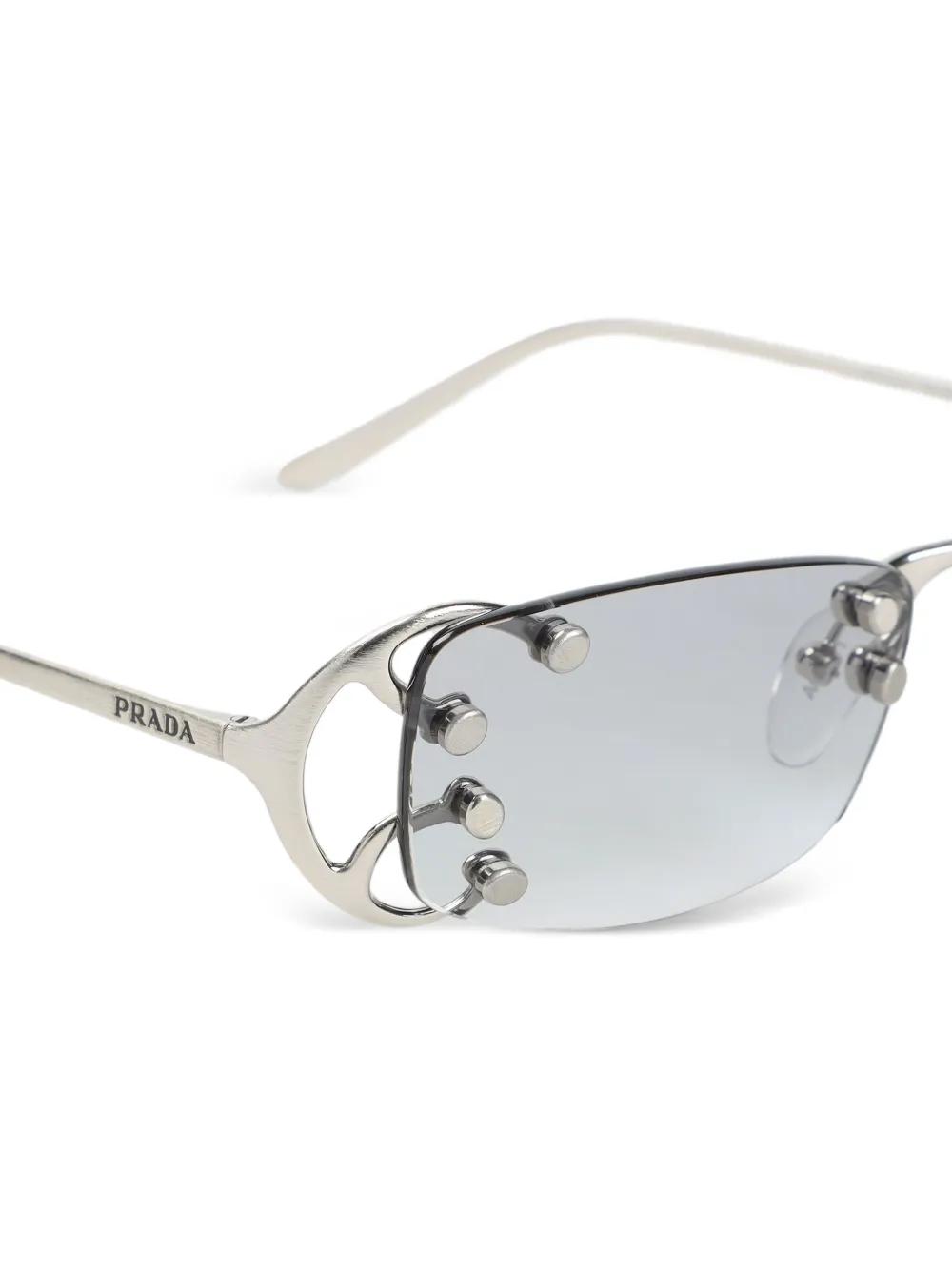 black cat-eye frame grey tinted lenses UV-protective lenses logo print at the arm sculpted arms curved tips
