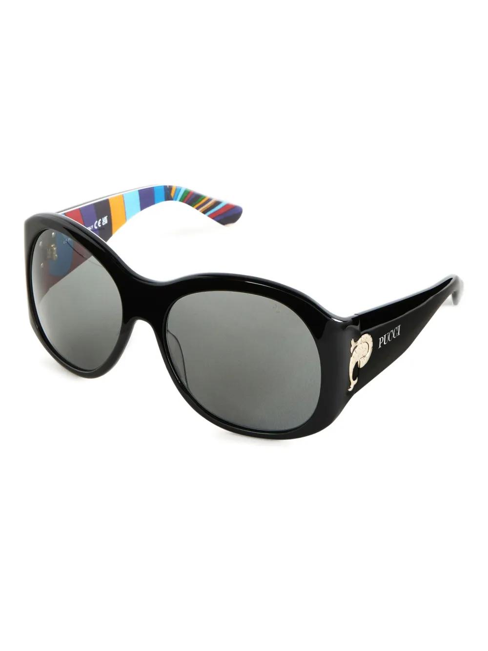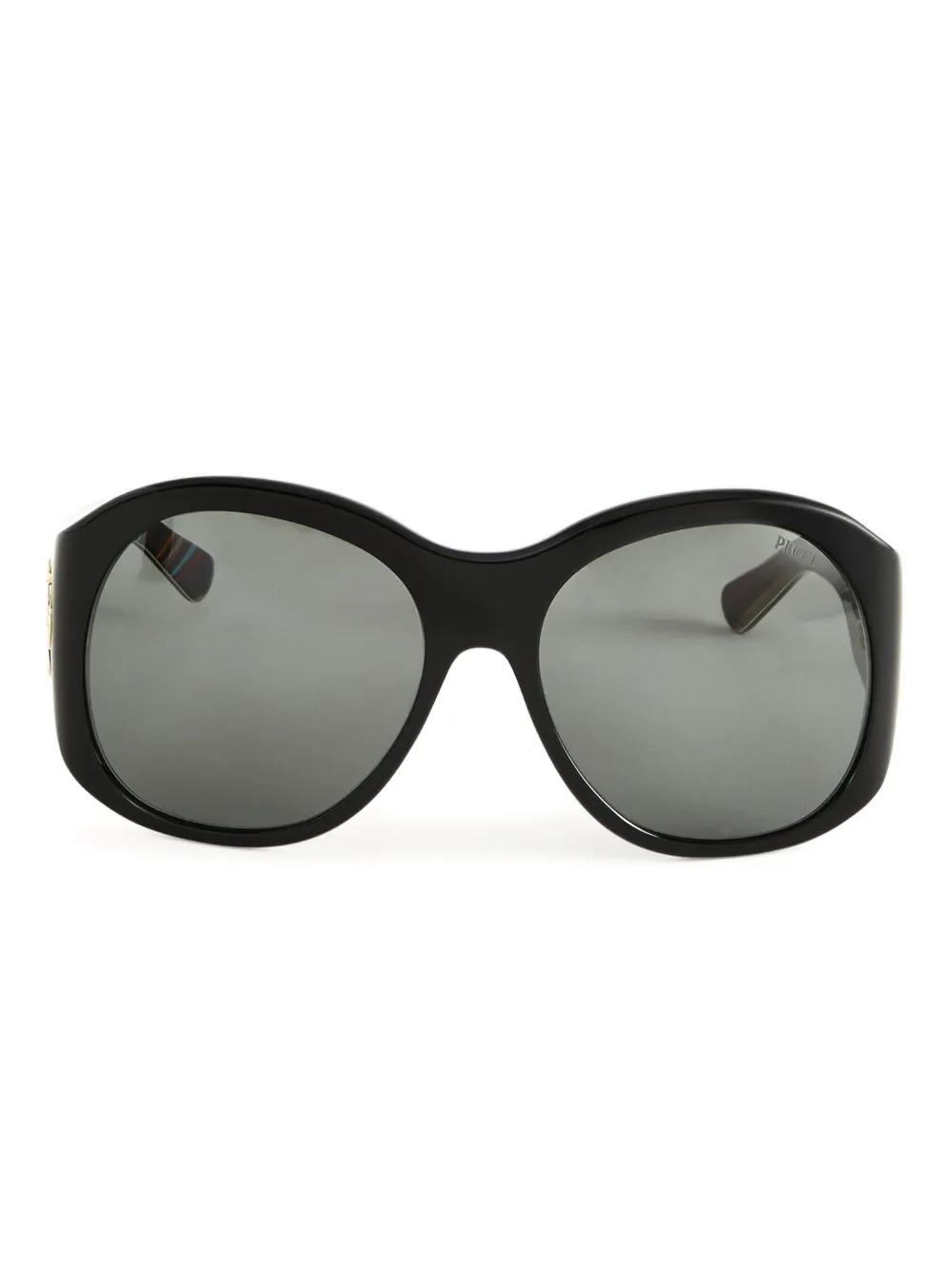 black round frame logo detail striped temple arms gold-tone accents tinted lenses These glasses come with a protective case.