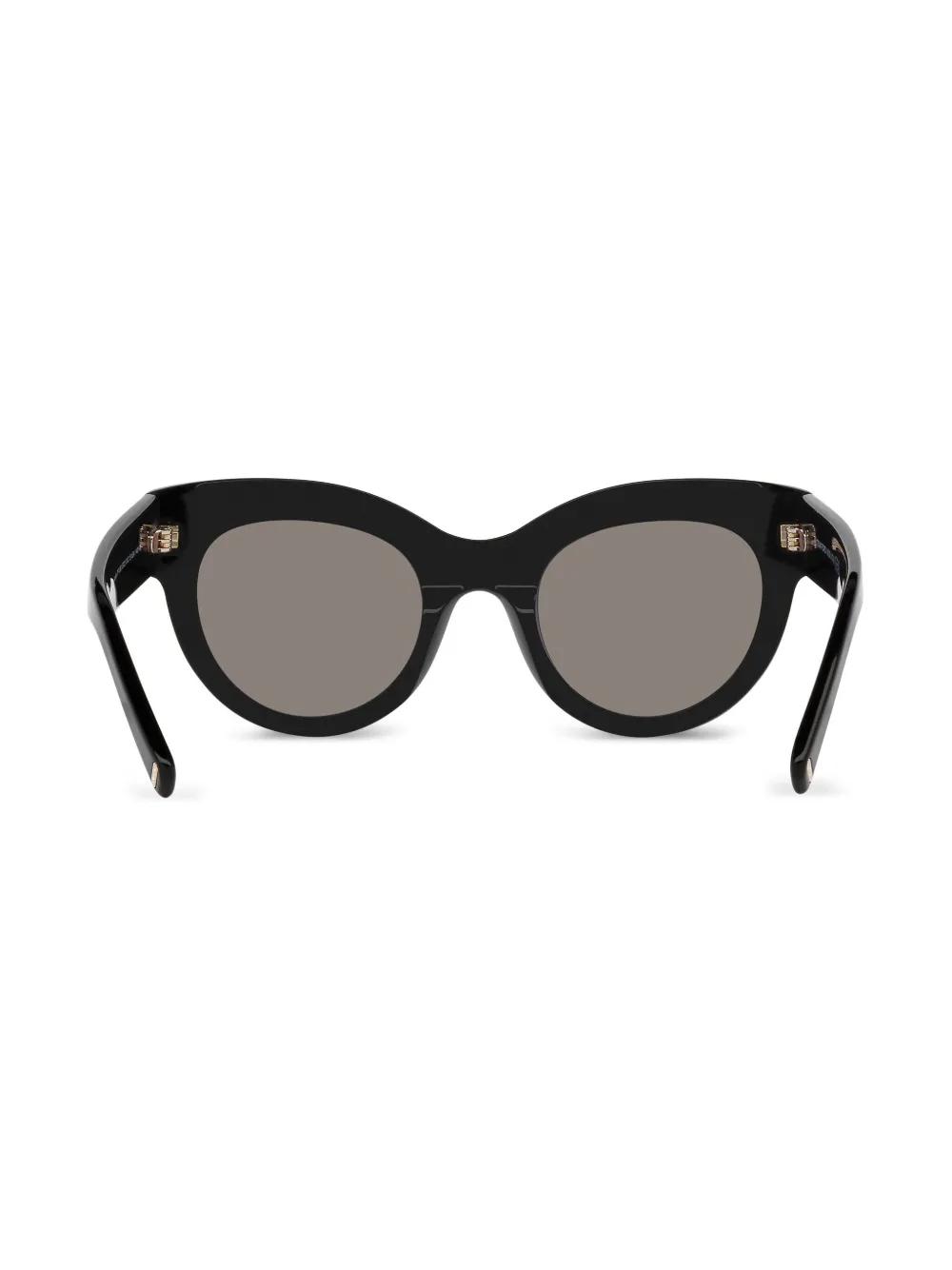 black acetate high-shine finish signature T-shaped hinge detail logo plaque at the tips lens decal cat-eye frame tinted lenses UV-protective lenses nose pads oversize arms curved tips These glasses come with a protective case.