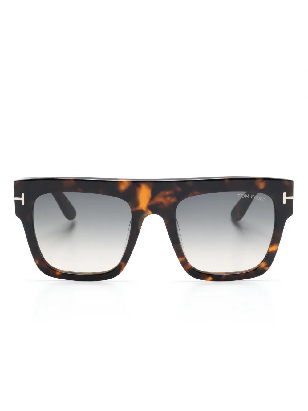 Havana brown acetate square frame tortoiseshell effect gradient lenses UV-protective lenses logo plaque at the arm sculpted arms curved tips These glasses come with a protective case.