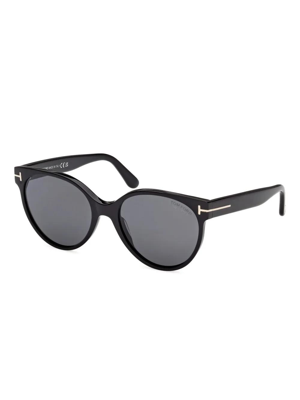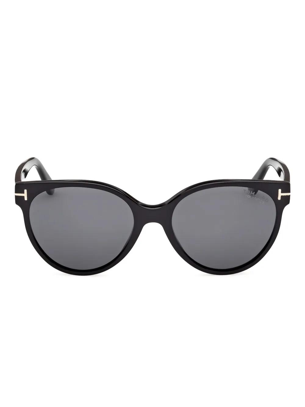black round frame logo detail at temple tinted lenses straight arms curved tips These glasses come with a protective case.