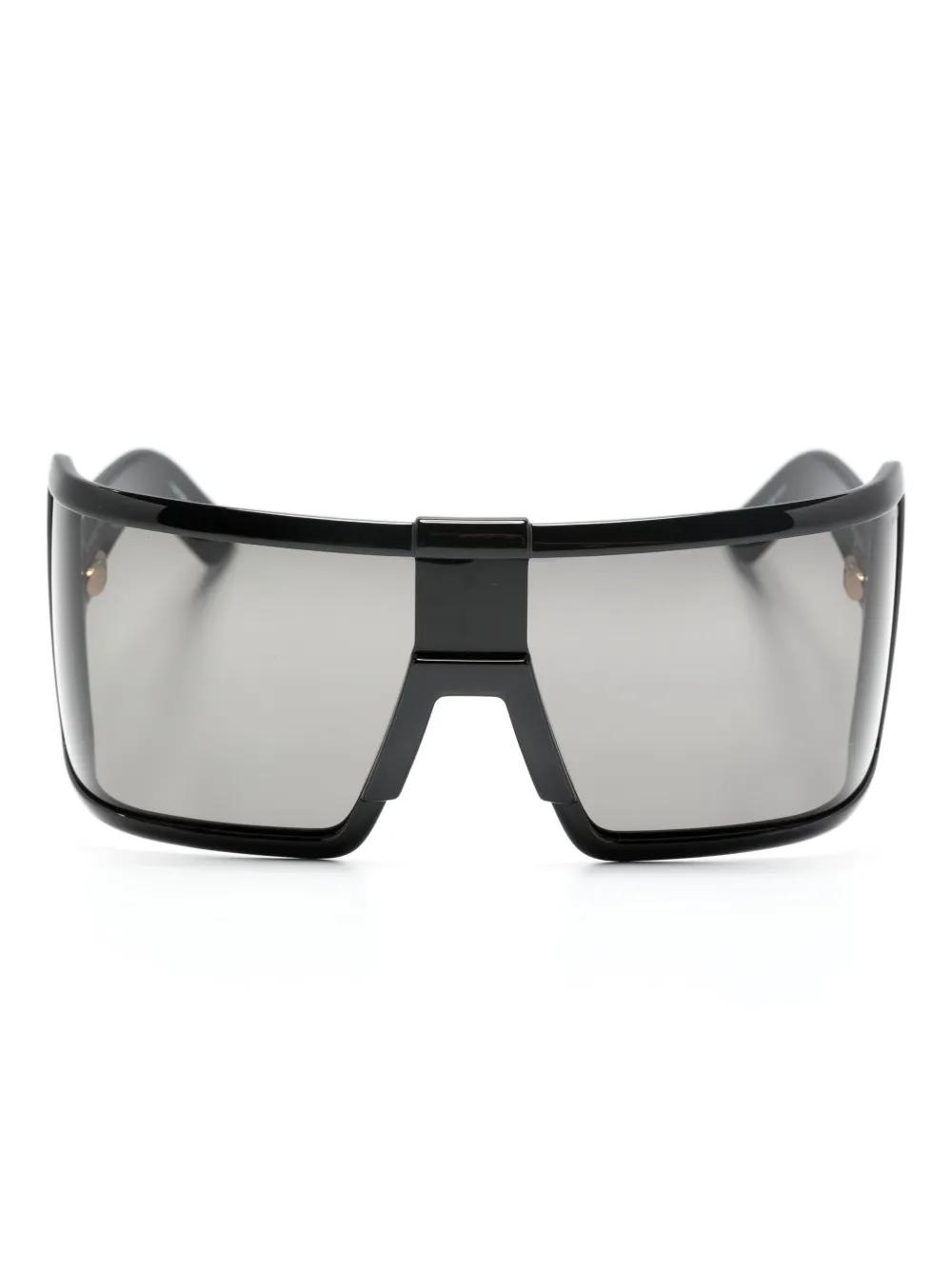 smoky black acetate shield frame grey tinted lenses UV-protective lenses sculpted arms curved tips These glasses come with a protective case.