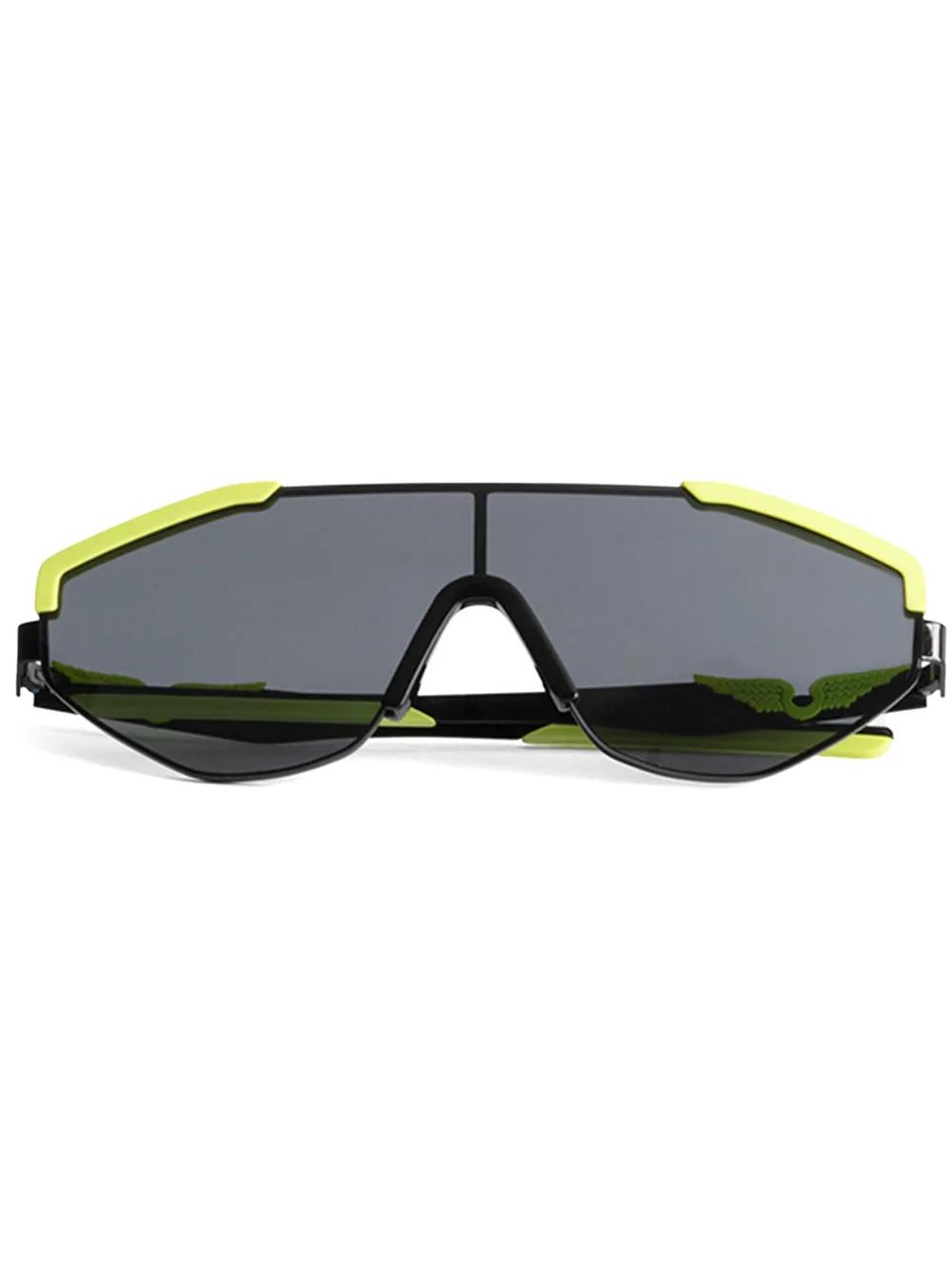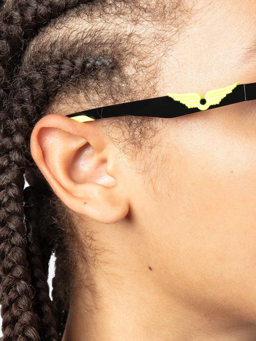 black/fluorescent yellow metal logo-embossed arm geometric frame grey tinted lenses straight arms straight tips These glasses come with a protective case.