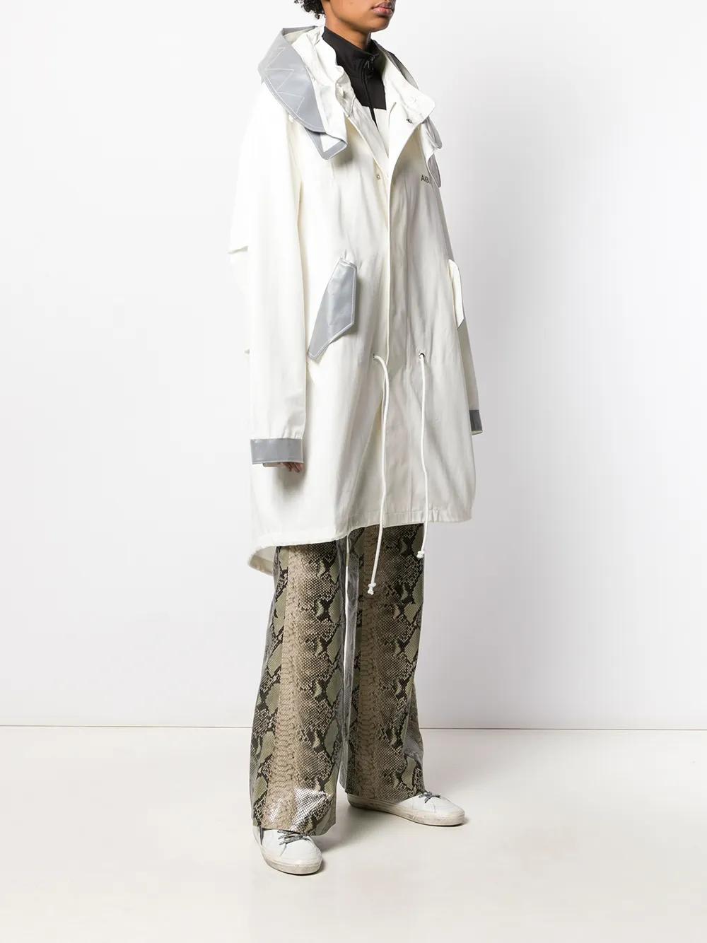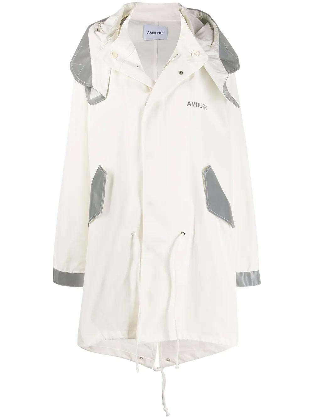 White cotton oversized hooded coat from AMBUSH featuring a front zip fastening, long sleeves, a two tone design, front flap pockets and a loose fit.