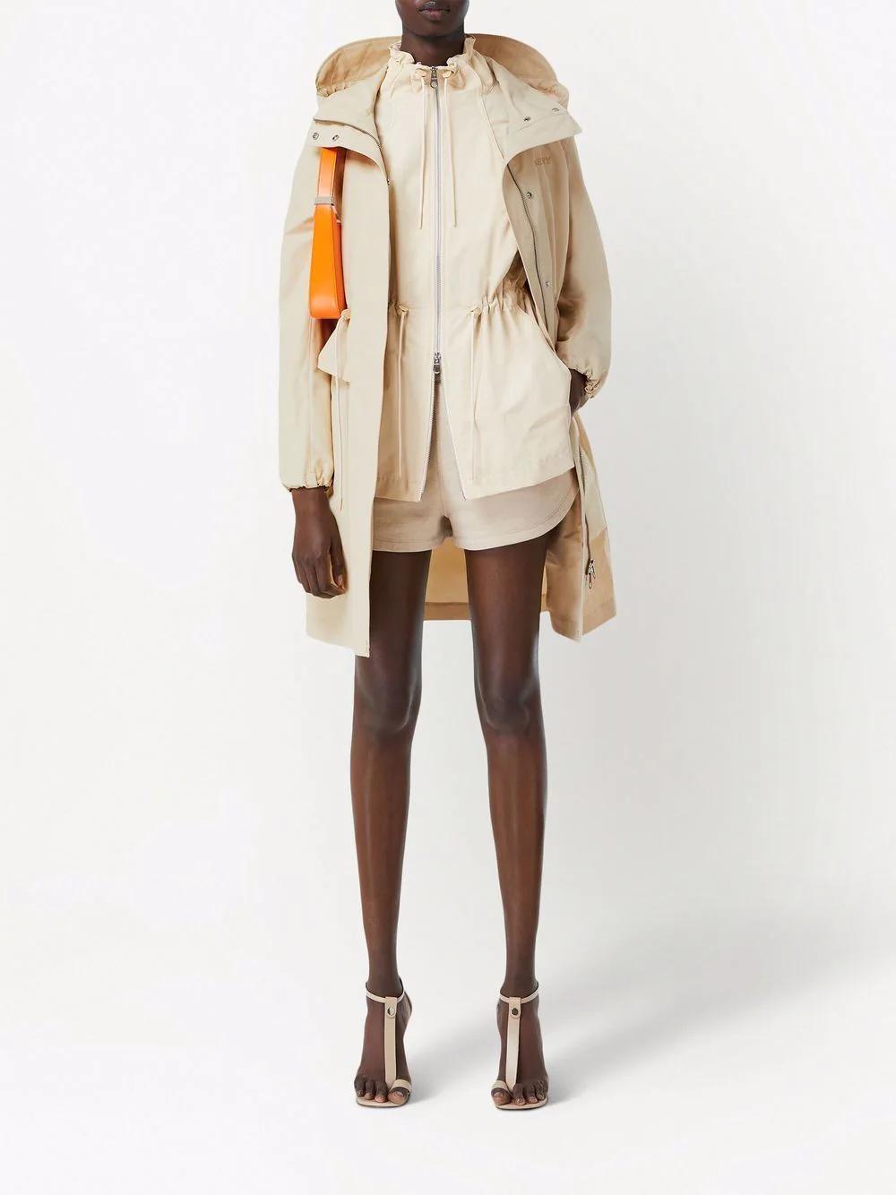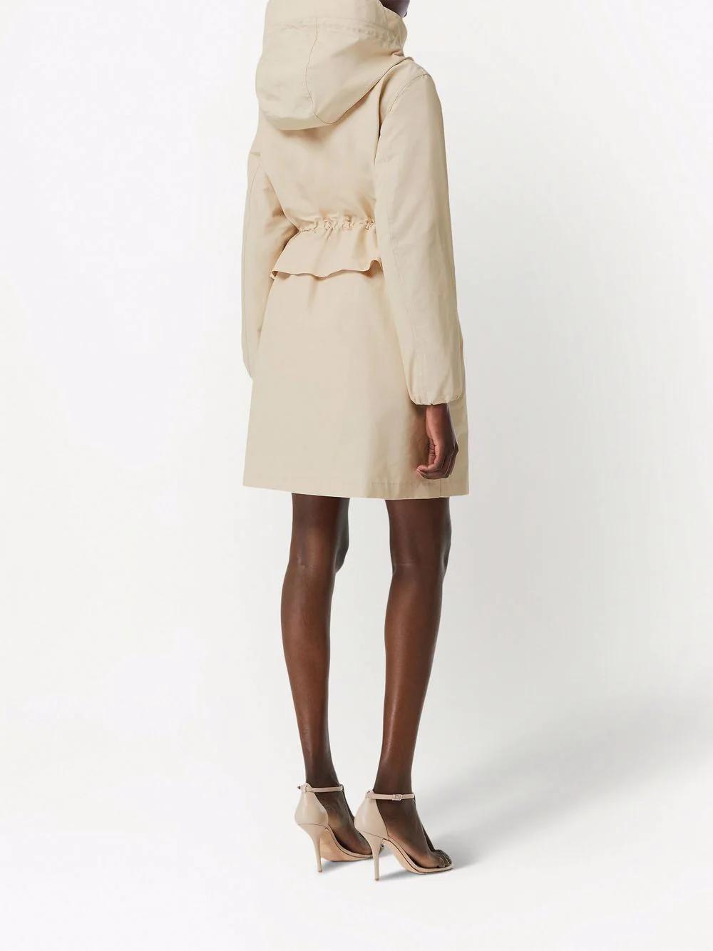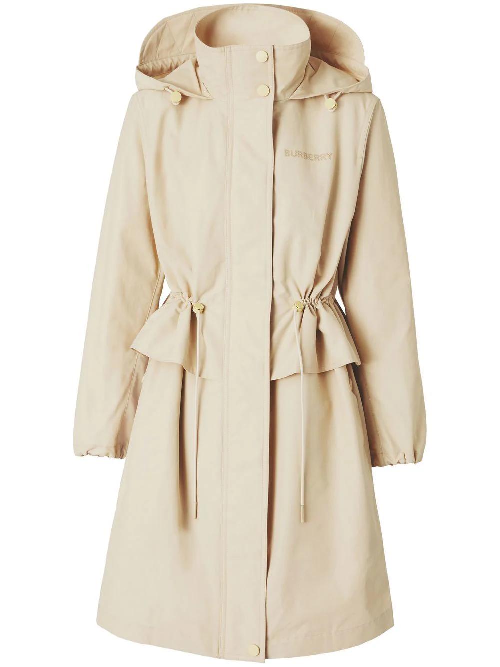 Light beige cotton frill-detail logo-print coat from BURBERRY featuring ruffled detailing, logo print at the chest, high neck, drawstring hood, front zip fastening, drawstring waist and mid-length.