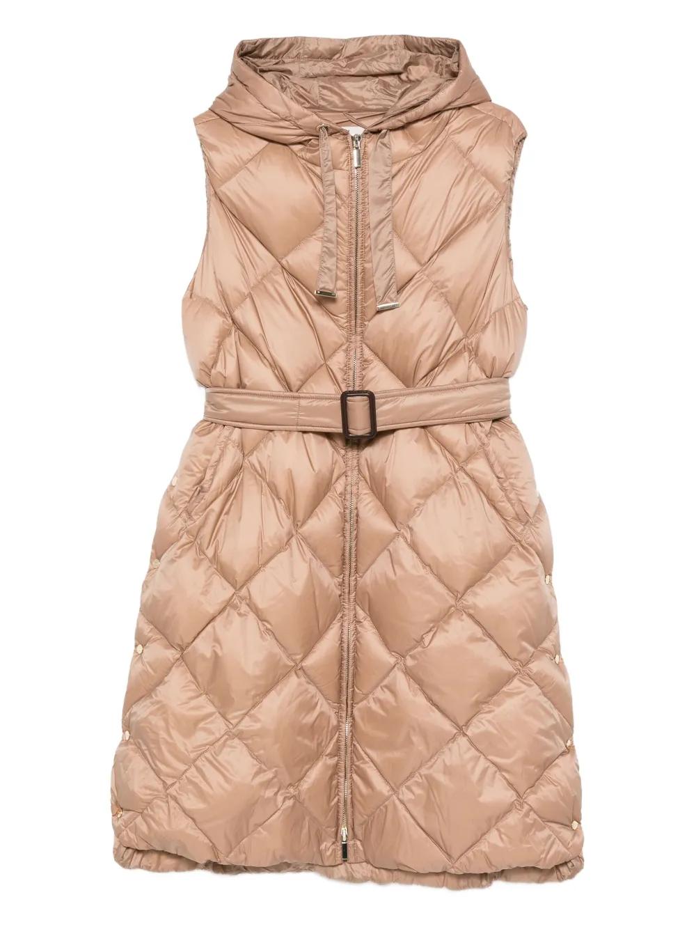 light brown quilted hooded zip fastening belted waist side seam pockets