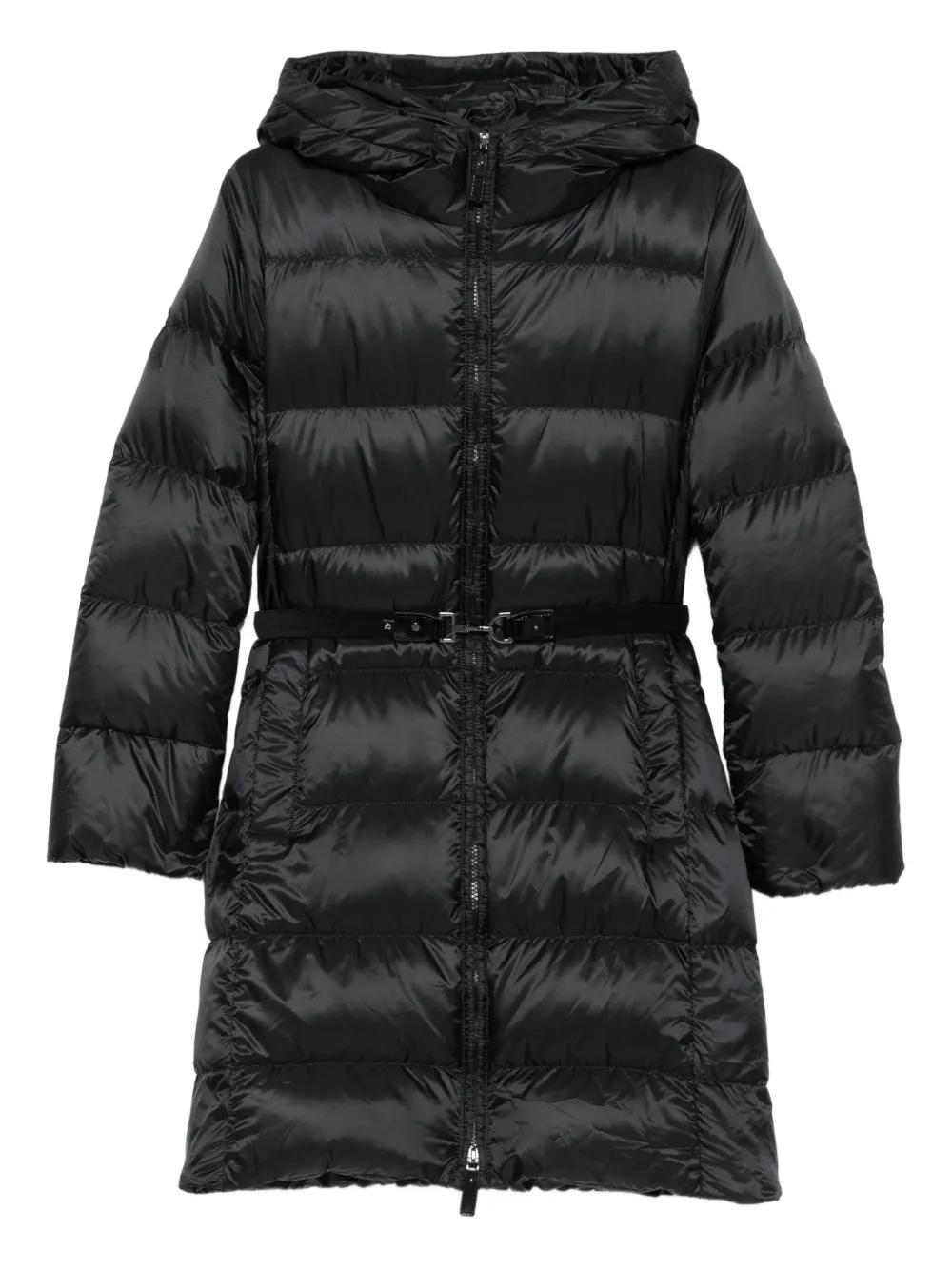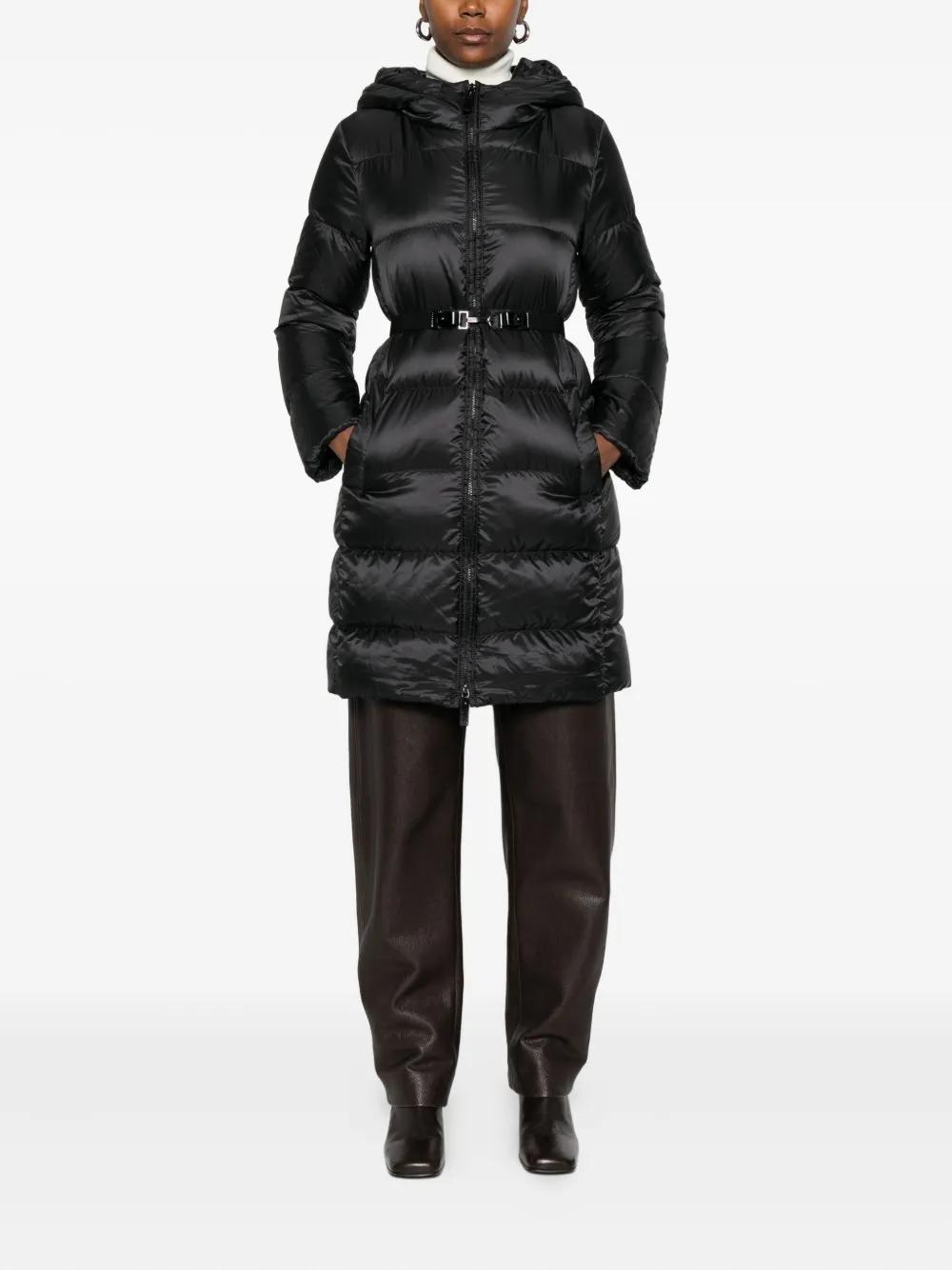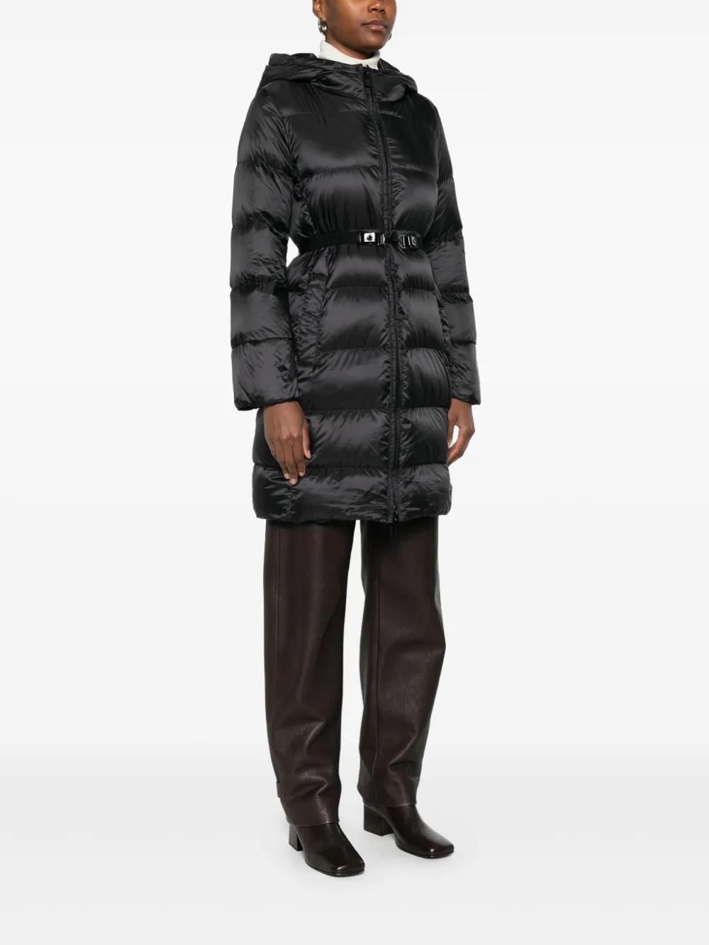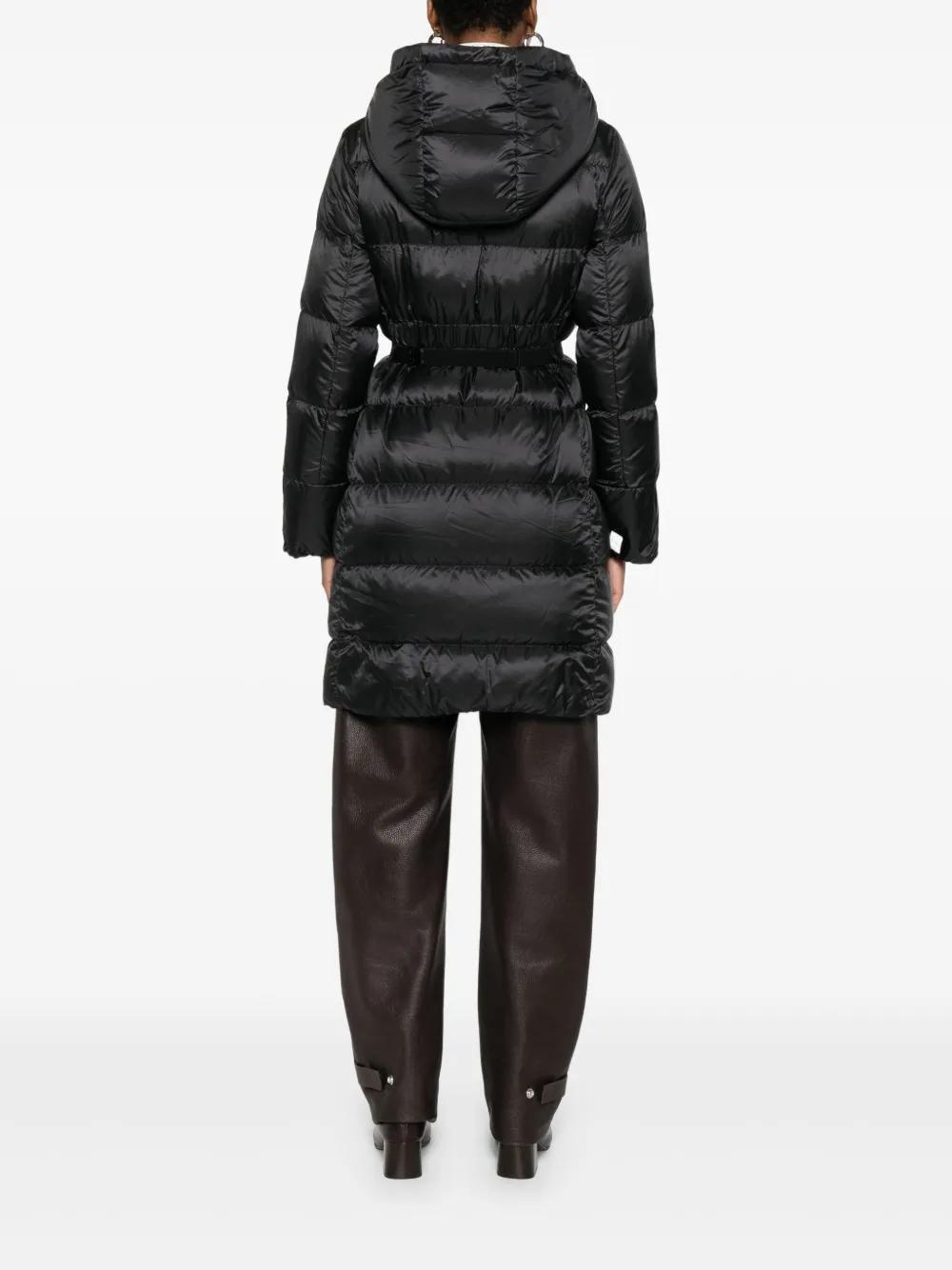 black hooded design quilted finish front zip fastening belted waist long sleeves