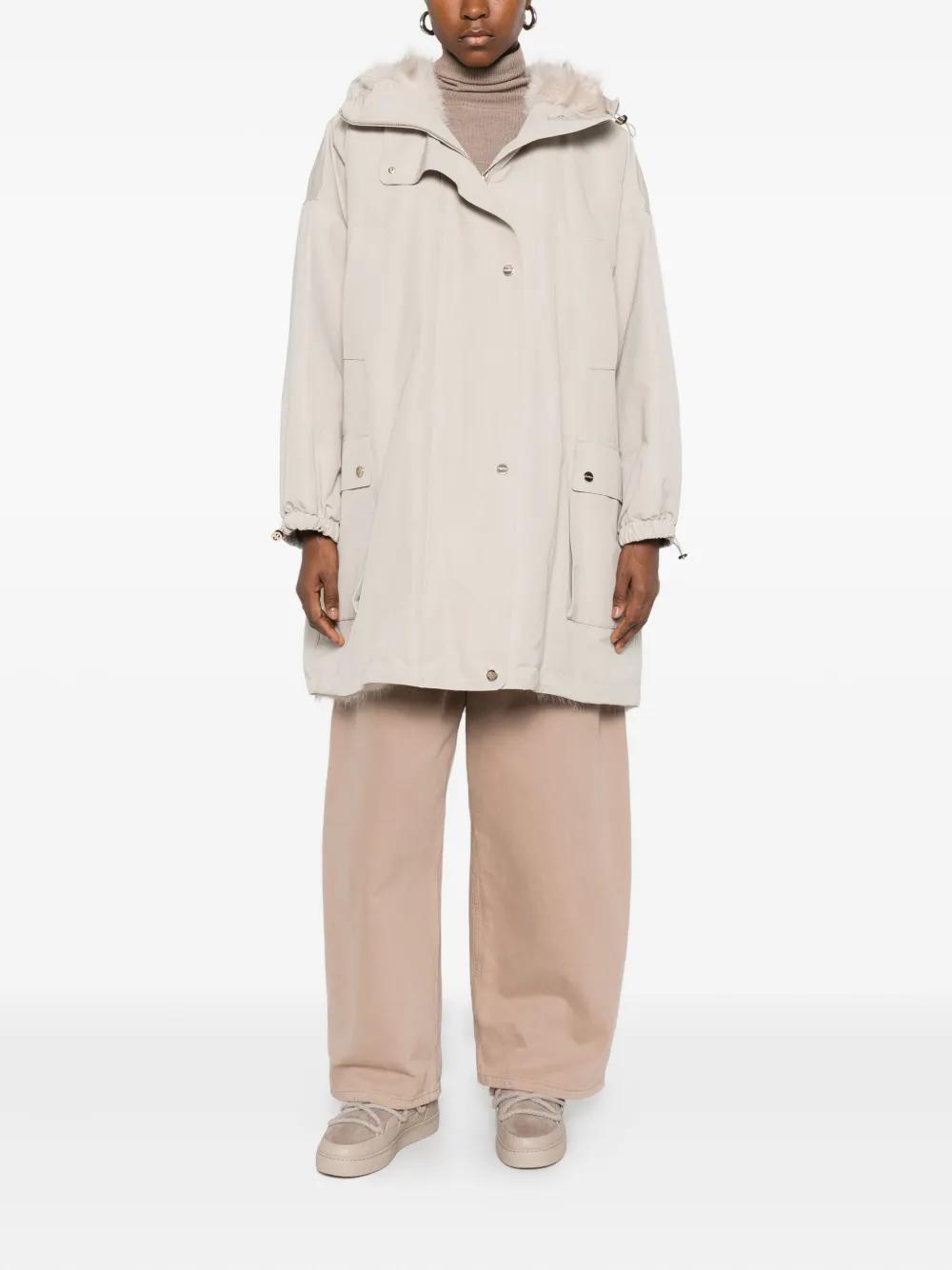 almond beige drawstring hood front press-stud and zip fastening drawstring hem two front flap pockets long sleeves