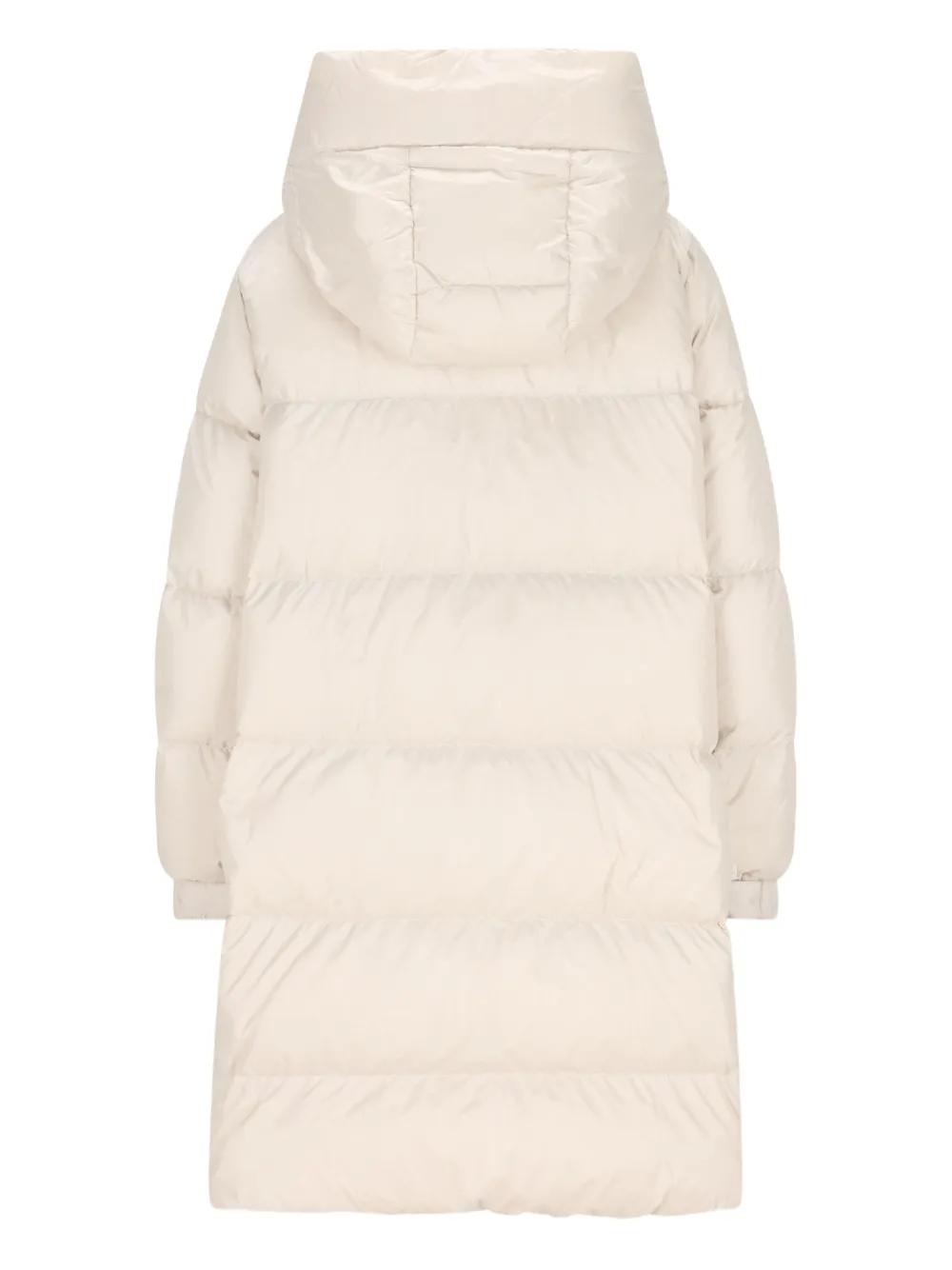 cream padded design drawstring hood front zip fastening side pockets quilted finish long sleeves